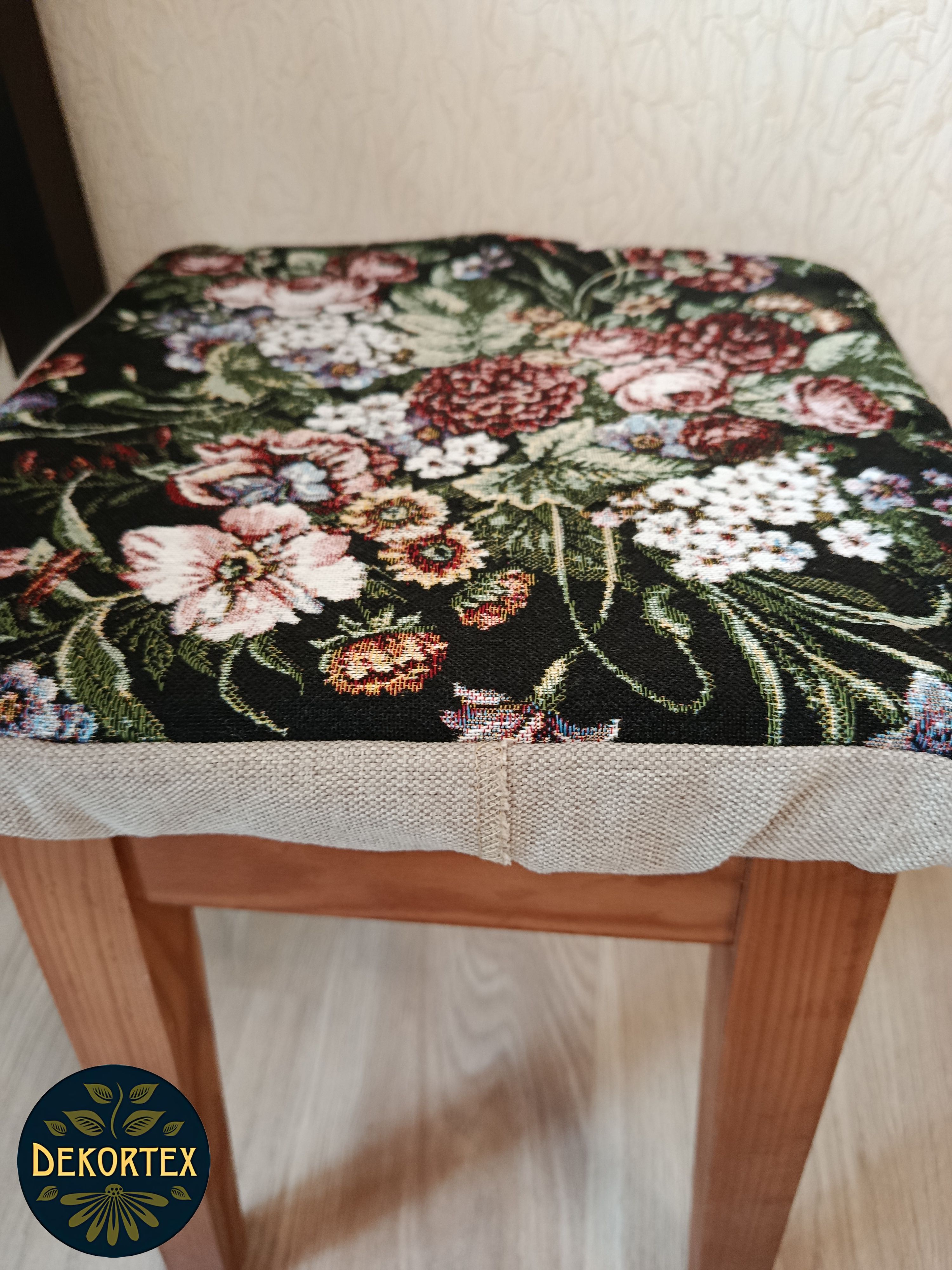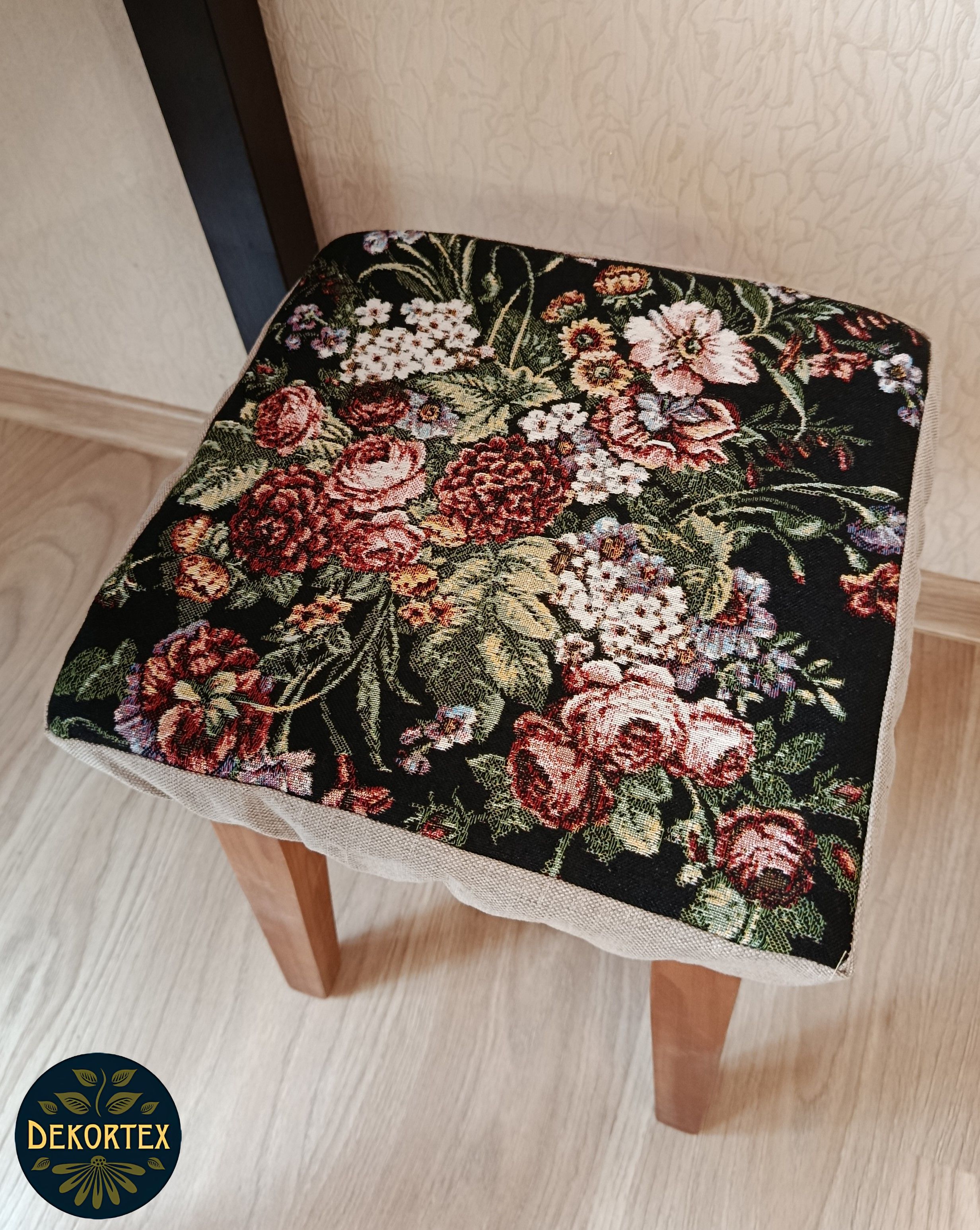 Чехол на табурет из гобелена квадратной формы размером 33х33 см. Верх выполнен из плотного, износостойкого гобелена Российского производства, плотностью 380 г/кв.м и однотонной рогожки. Крепится на табурет с помощью резинки. Благодаря поролоновой вставке высотой 2 см скроет на поверхности табурета неровности, потертости и придаст комфорт при использовании. Поролон легко вынимается и Вы можете почистить или постирать гобеленовый чехол. Допускается бережная стирка. Состав гобелена: 100% П/Э. Допускается погрешность размере табуретницы 1см.