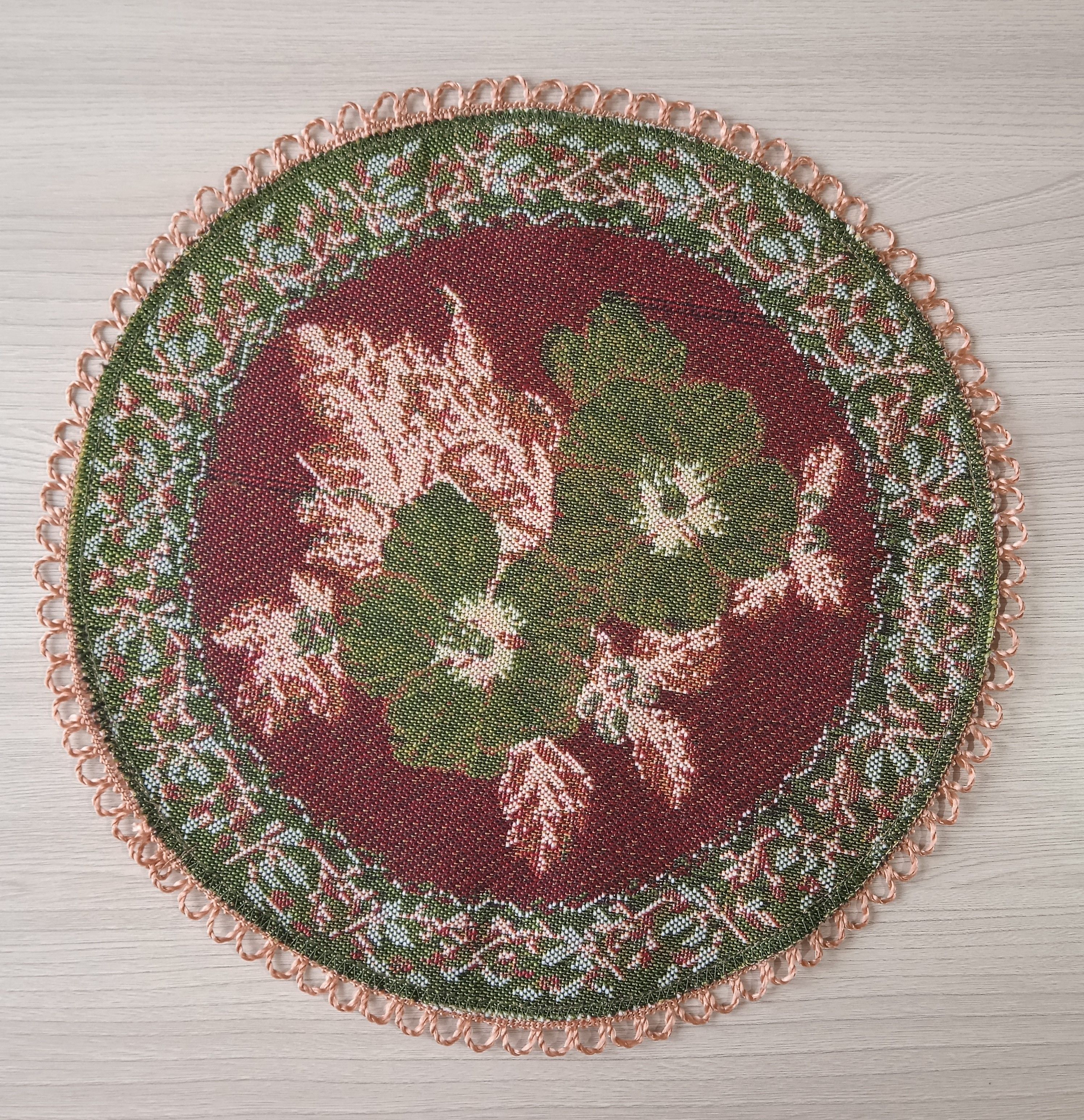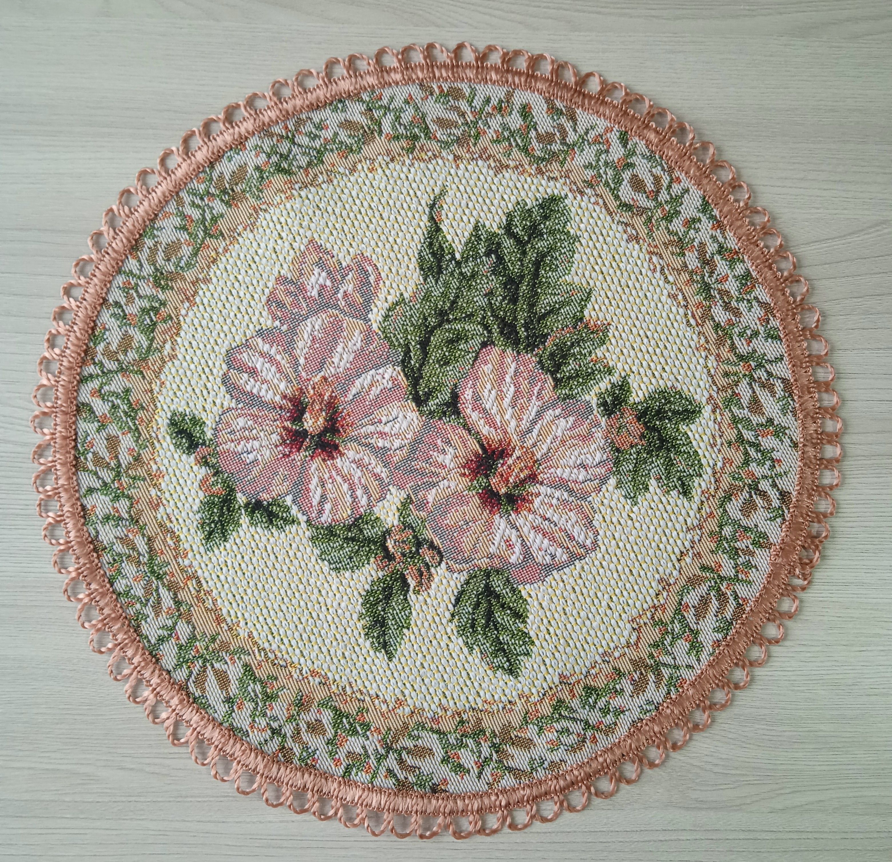Салфетка декоративная из гобеленовой ткани с цветочным рисунком . Нежные, светлые тона рисунка совпадают с весенним настроением цветущего сада. Круглая салфетка с декоративной тесьмой прекрасное украшение для сервировки стола. Салфетка может стать приятным подарком для Ваших родных и близких. Такие не дорогие но очень приятные предметы интерьера позволяют нам добавить в привычный быт атмосферу красоты и праздника.
