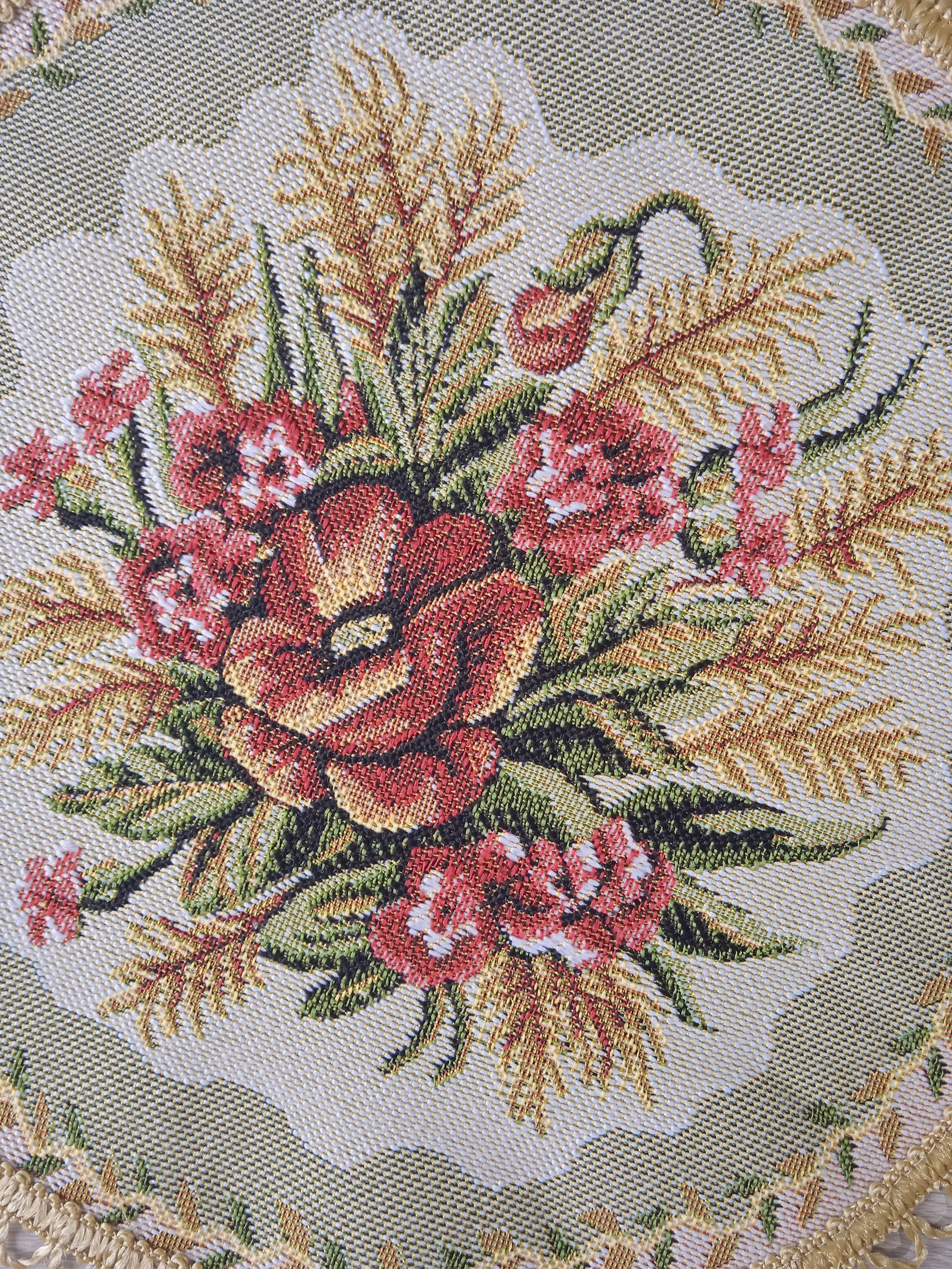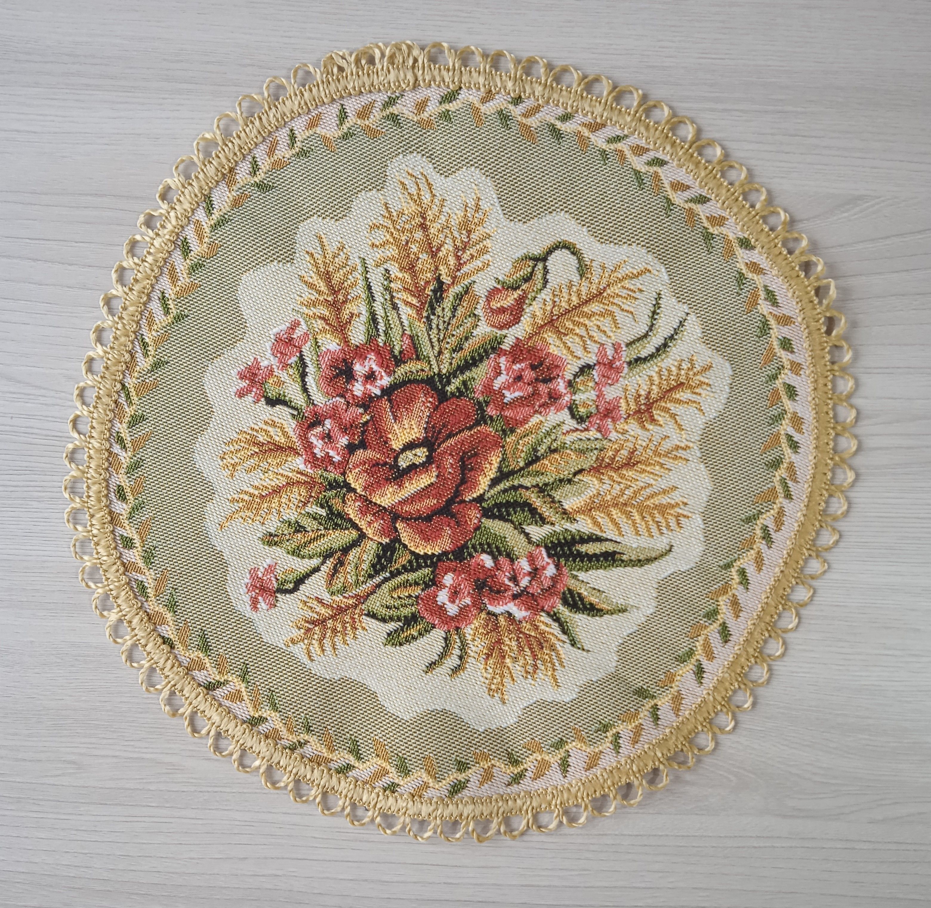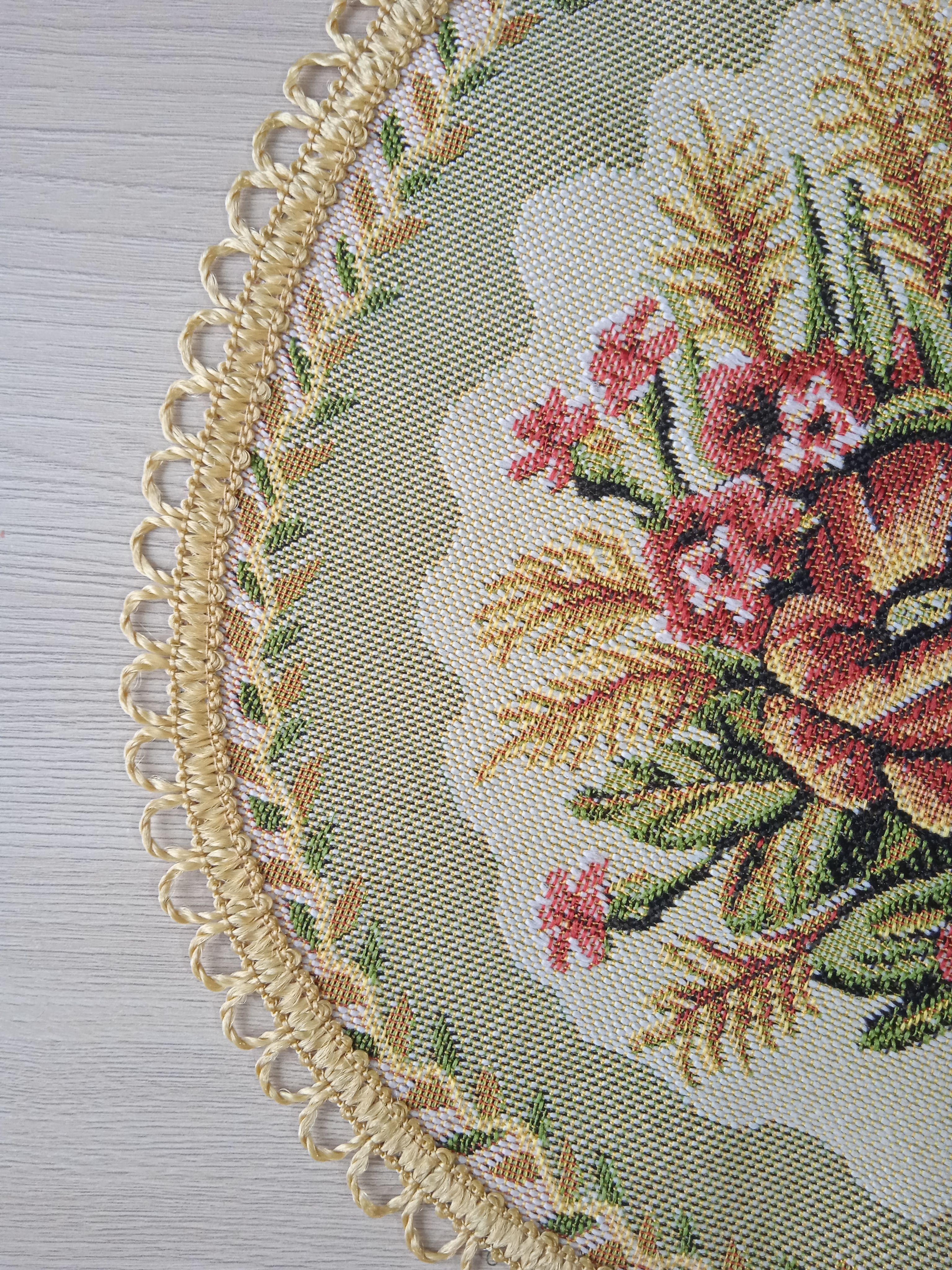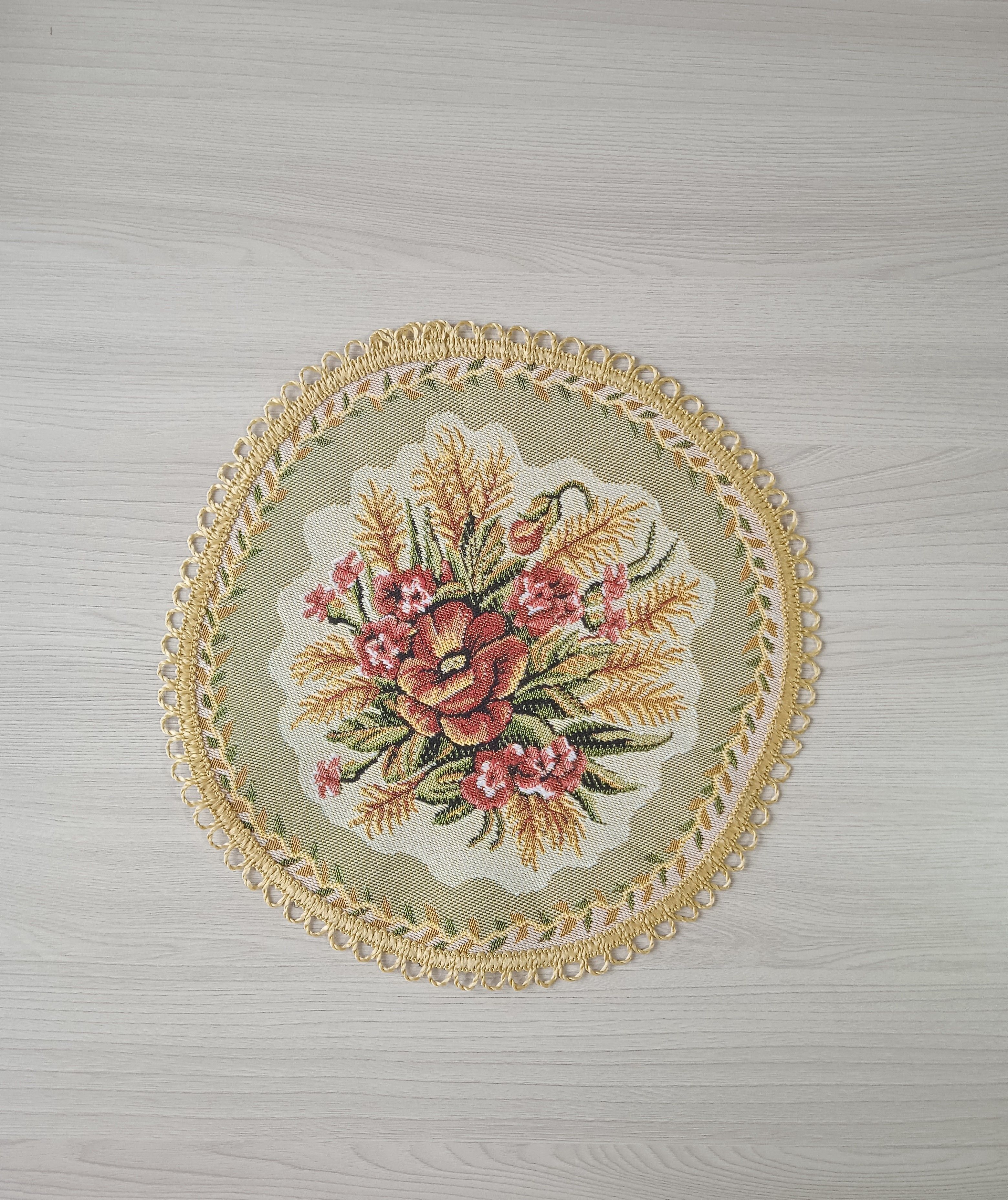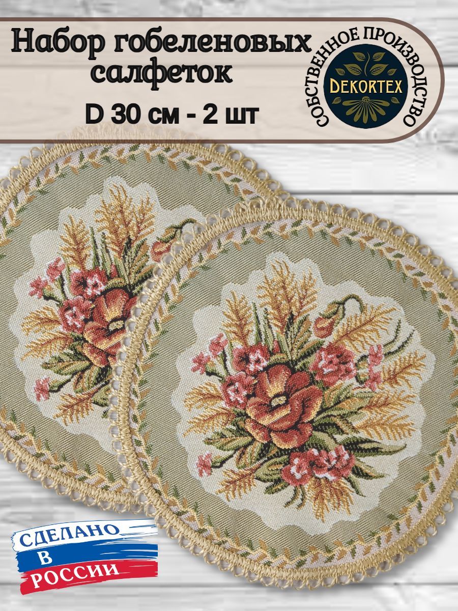 Декоративные гобеленовые салфетки это приятное и полезное украшение для сервировки стола. Салфетки могут продаваться по одной или наборами от двух до десяти штук. Форма, размер, цвет и рисунок салфеток можно выбрать по желанию покупателя. Декоративные салфетки круглой и овальной формы как правило обработаны красивой декоративной тесьмой подходящей по цвету к рисунку на ткани. Гобеленовые декоративные салфетки не только модный, красивый предмет интерьера но и полезны и практичны в использовании. Салфетки помогут предохранить поверхность мебели от повреждения. Гобеленовые салфетки устойчивы к загрязнению, хорошо стираются при температуре 30 градусов на дают усадки не линяют. Изделия из гобеленовой ткани имеют длительный срок службы и сохраняют первоначальный вид и форму.