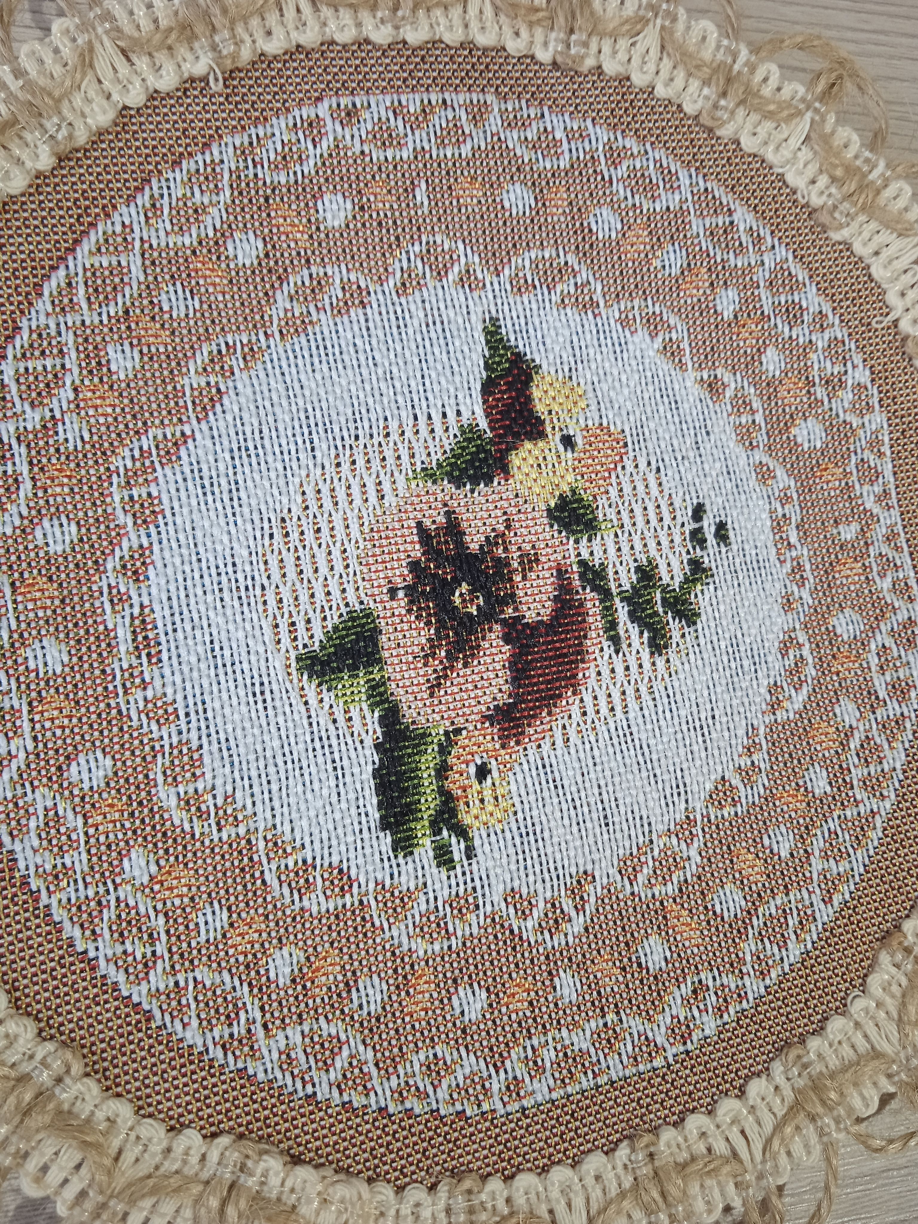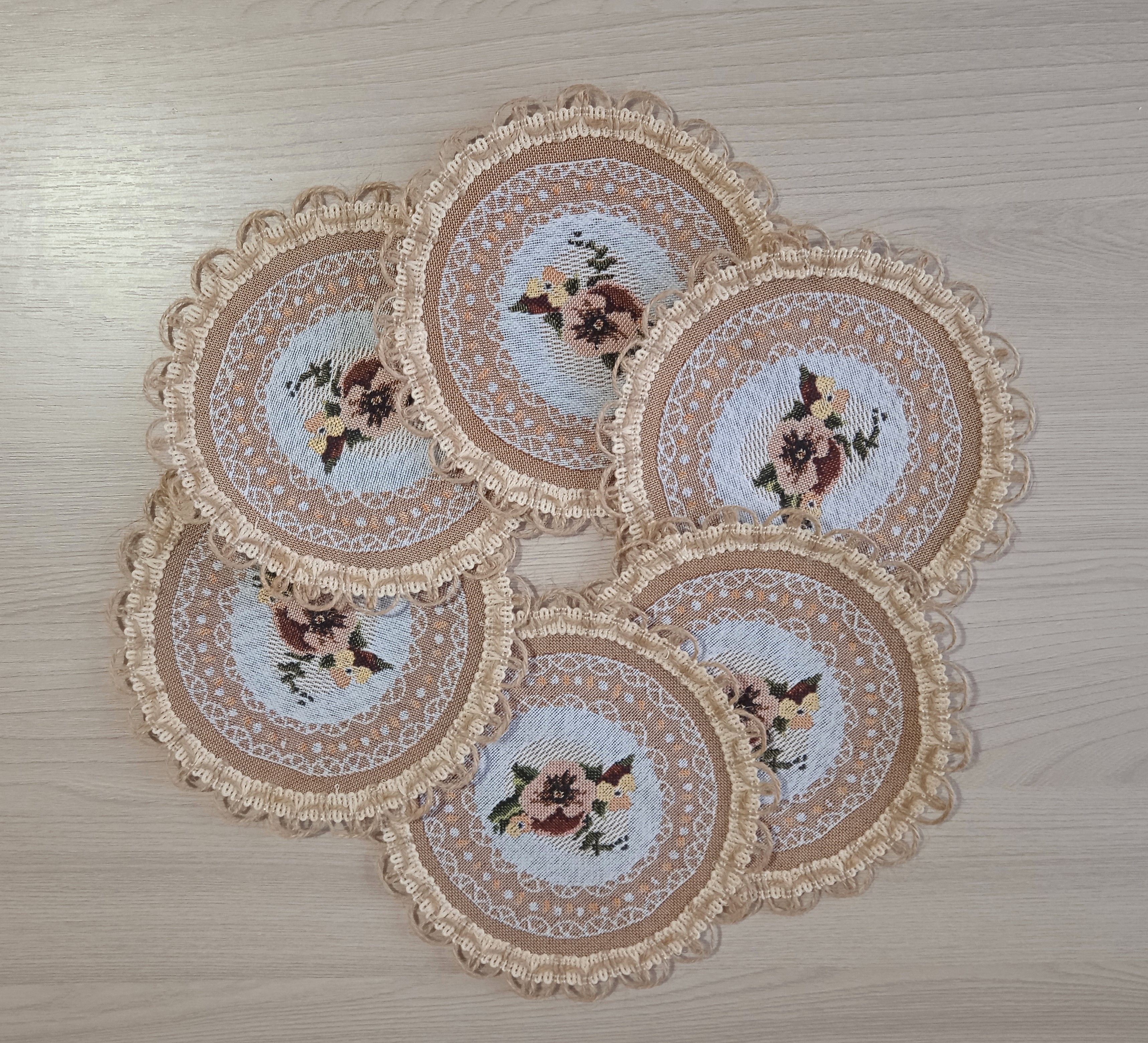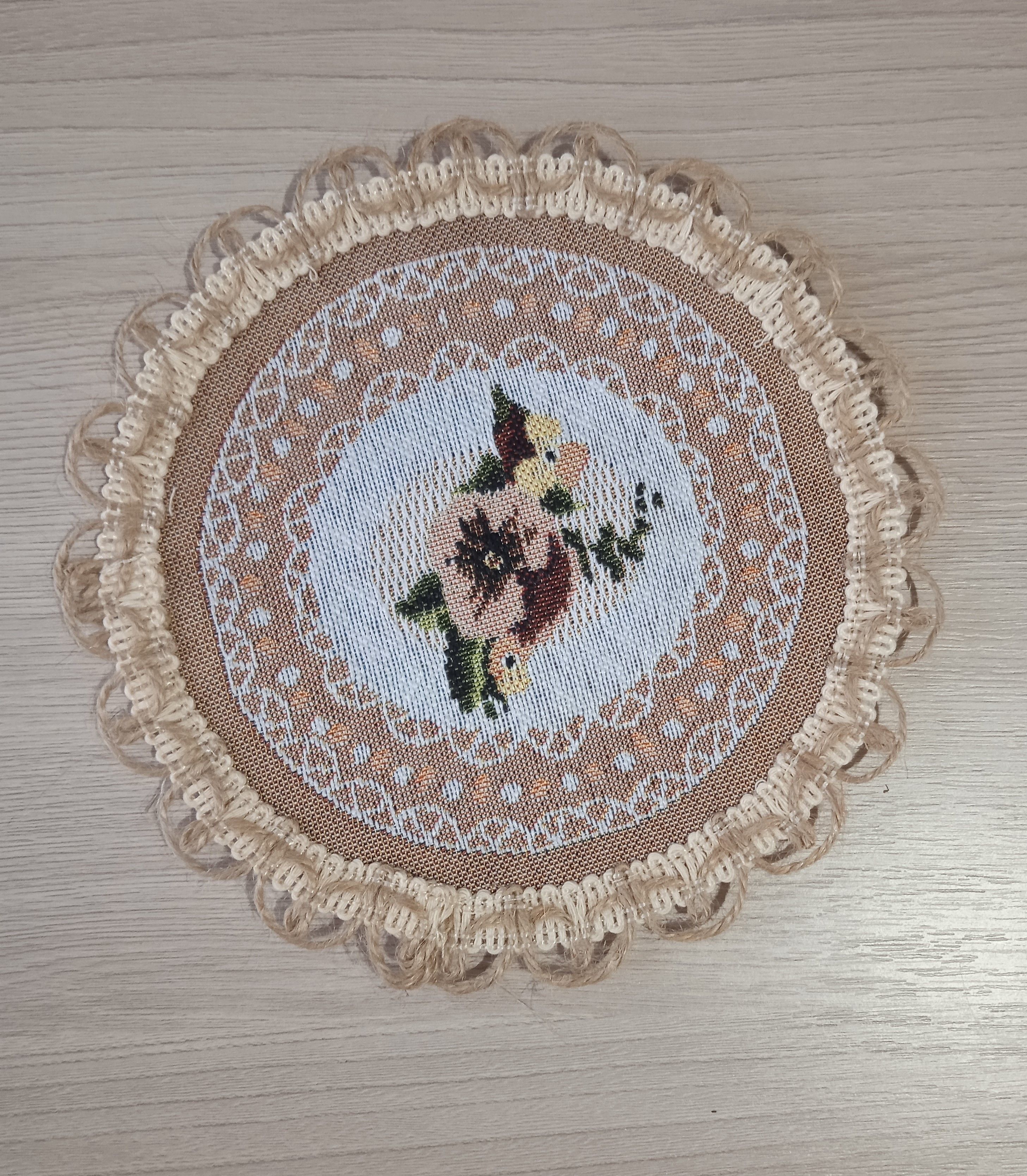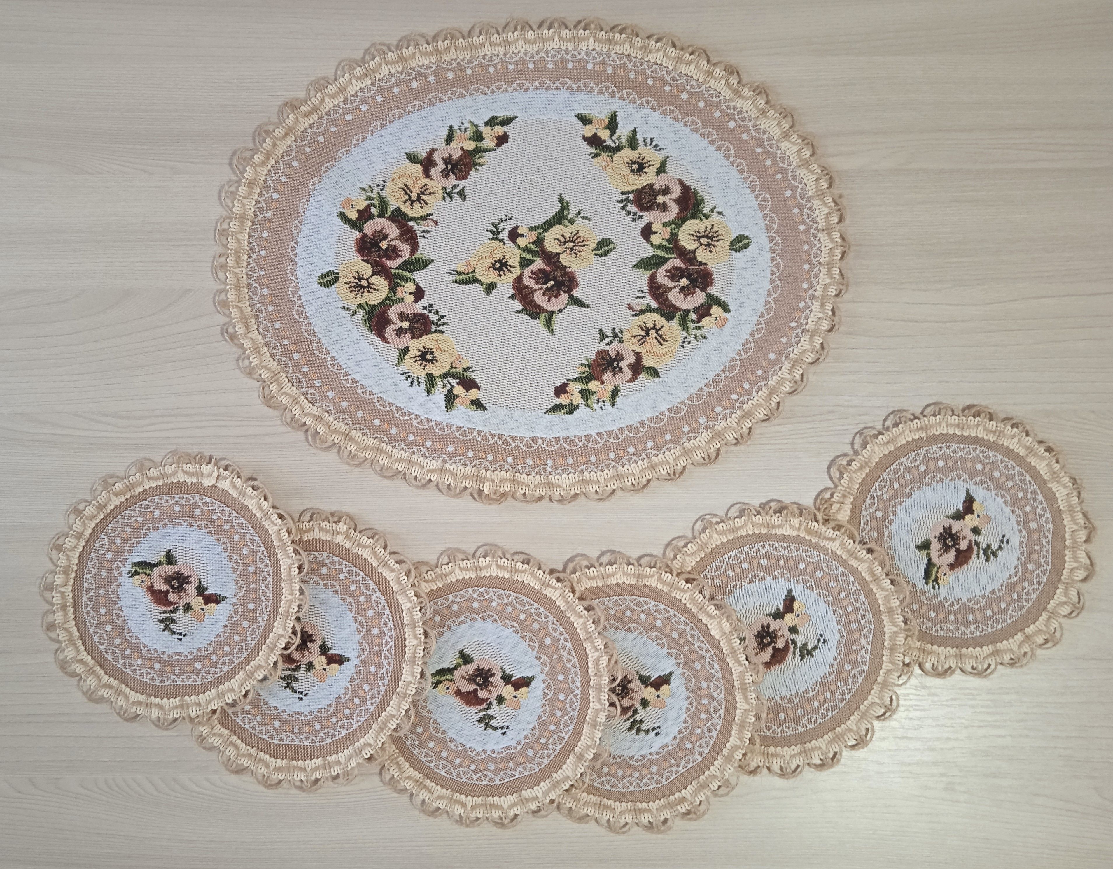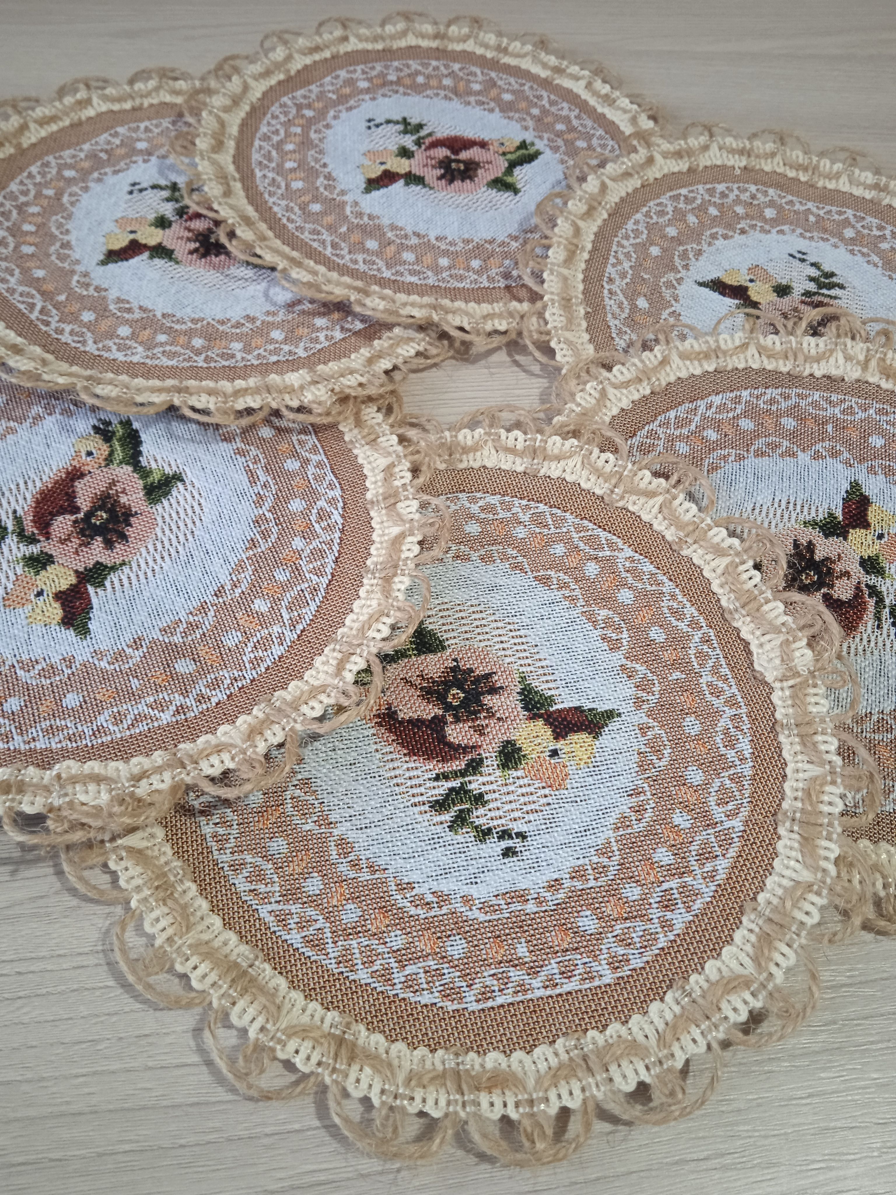 Декоративные гобеленовые салфетки это приятное и полезное украшение для сервировки стола. Салфетки могут продаваться по одной или наборами от двух до десяти штук. Форма, размер, цвет и рисунок салфеток можно выбрать по желанию покупателя. Декоративные салфетки круглой и овальной формы как правило обработаны красивой декоративной тесьмой подходящей по цвету к рисунку на ткани. Цвет тесьмы может отличаться от представленного на фото. Гобеленовые декоративные салфетки не только модный, красивый предмет интерьера но и полезны и практичны в использовании. Салфетки помогут предохранить поверхность мебели от повреждения. Гобеленовые салфетки устойчивы к загрязнению, хорошо стираются при температуре 30 градусов на дают усадки не линяют. Изделия из гобеленовой ткани имеют длительный срок службы и сохраняют первоначальный вид и форму.