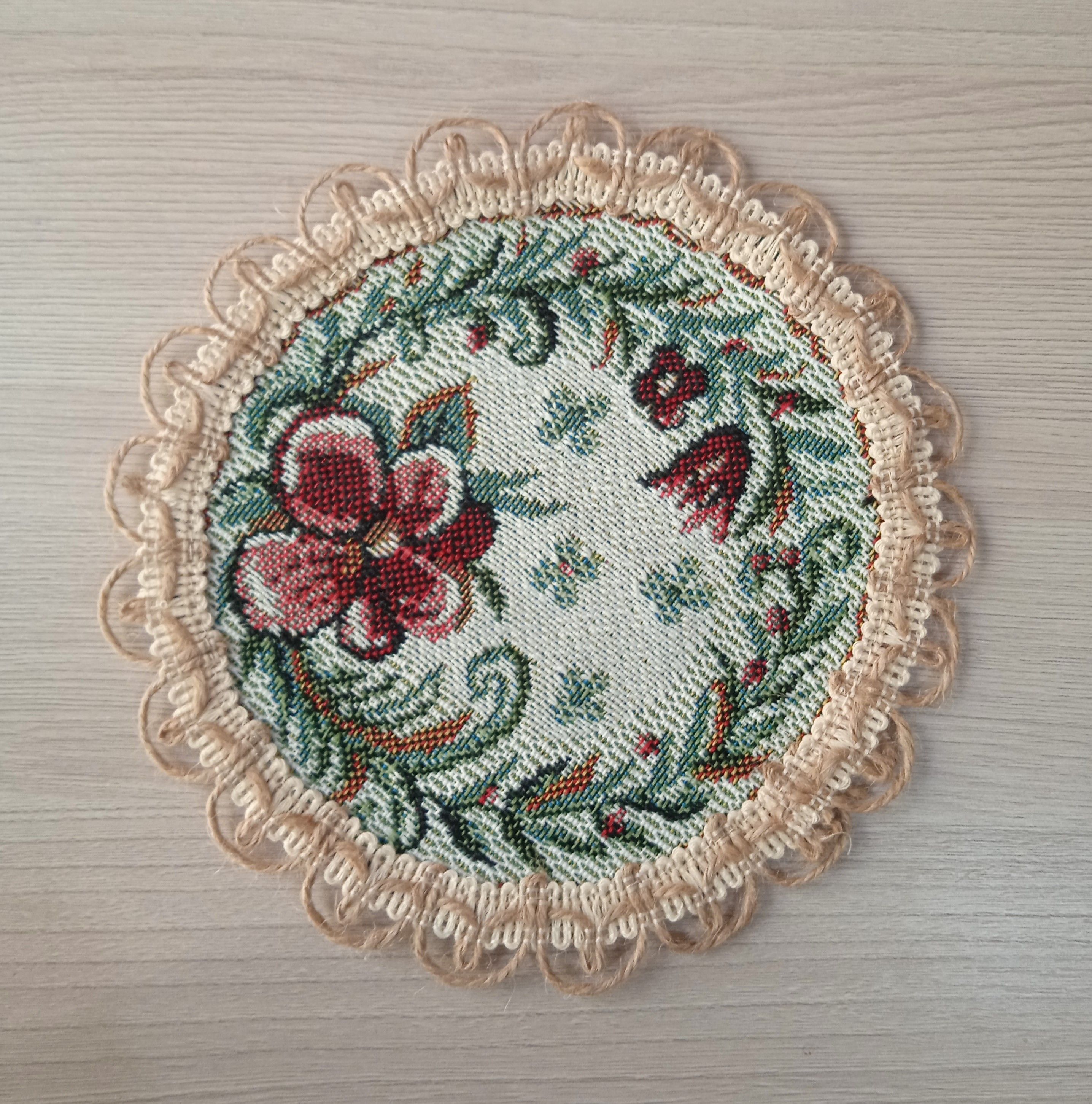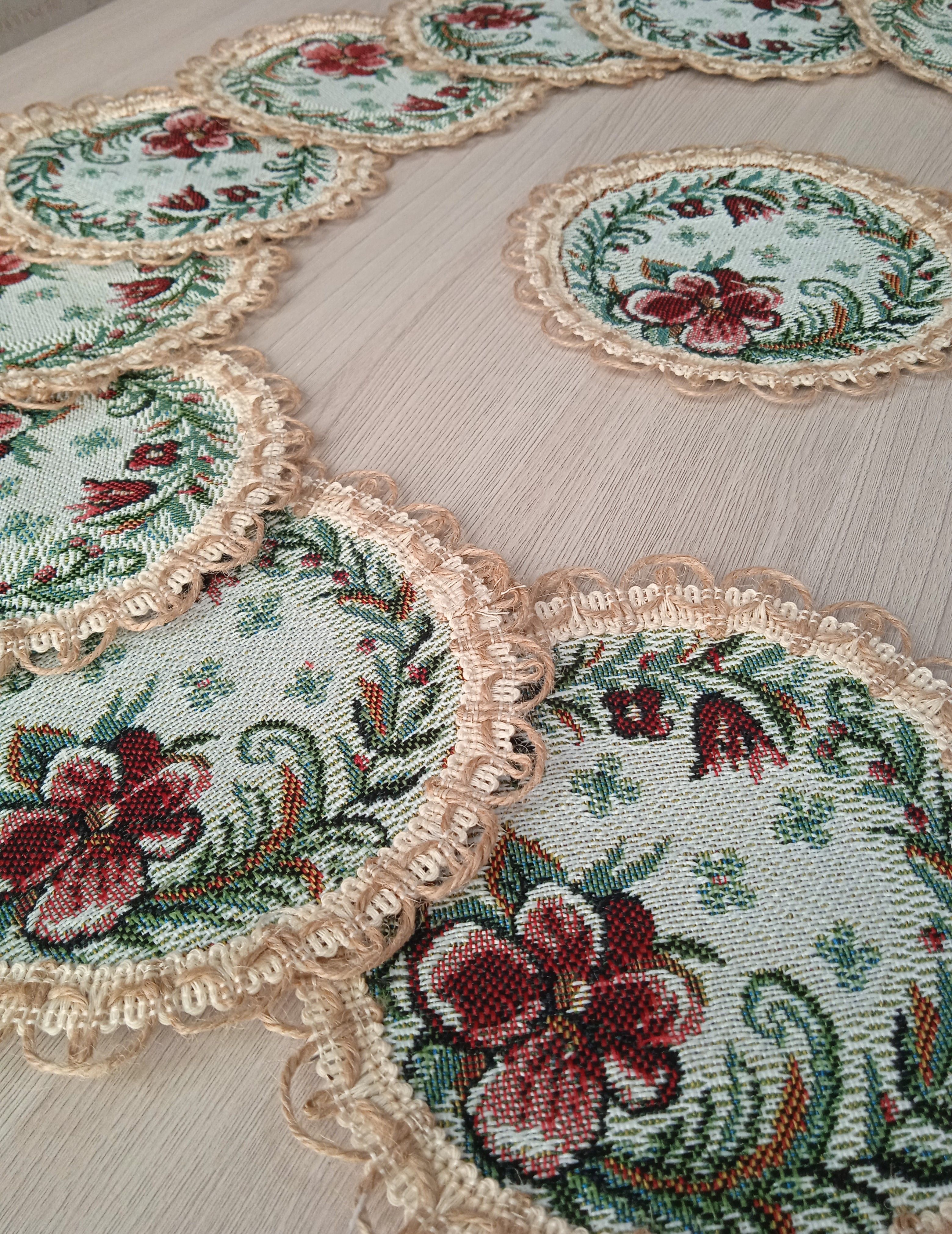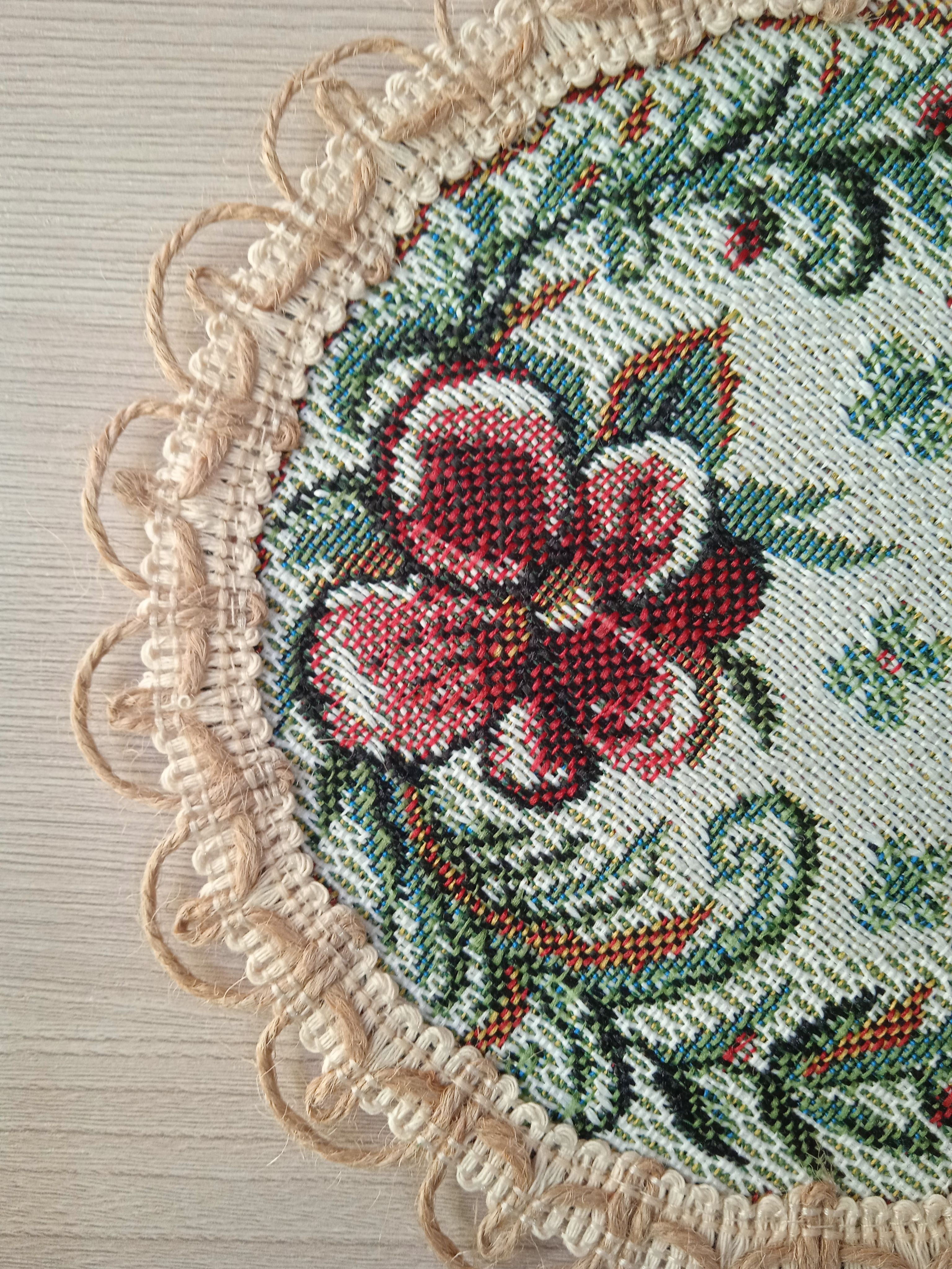 Декоративные гобеленовые салфетки это приятное и полезное украшение для сервировки стола. Салфетки могут продаваться по одной или наборами от двух до десяти штук. Форма, размер, цвет и рисунок салфеток можно выбрать по желанию покупателя. Декоративные салфетки круглой и овальной формы как правило обработаны красивой декоративной тесьмой подходящей по цвету к рисунку на ткани. Цвет тесьмы может отличаться от представленного на фото. Гобеленовые декоративные салфетки не только модный, красивый предмет интерьера но и полезны и практичны в использовании. Салфетки помогут предохранить поверхность мебели от повреждения. Гобеленовые салфетки устойчивы к загрязнению, хорошо стираются при температуре 30 градусов на дают усадки не линяют. Изделия из гобеленовой ткани имеют длительный срок службы и сохраняют первоначальный вид и форму.