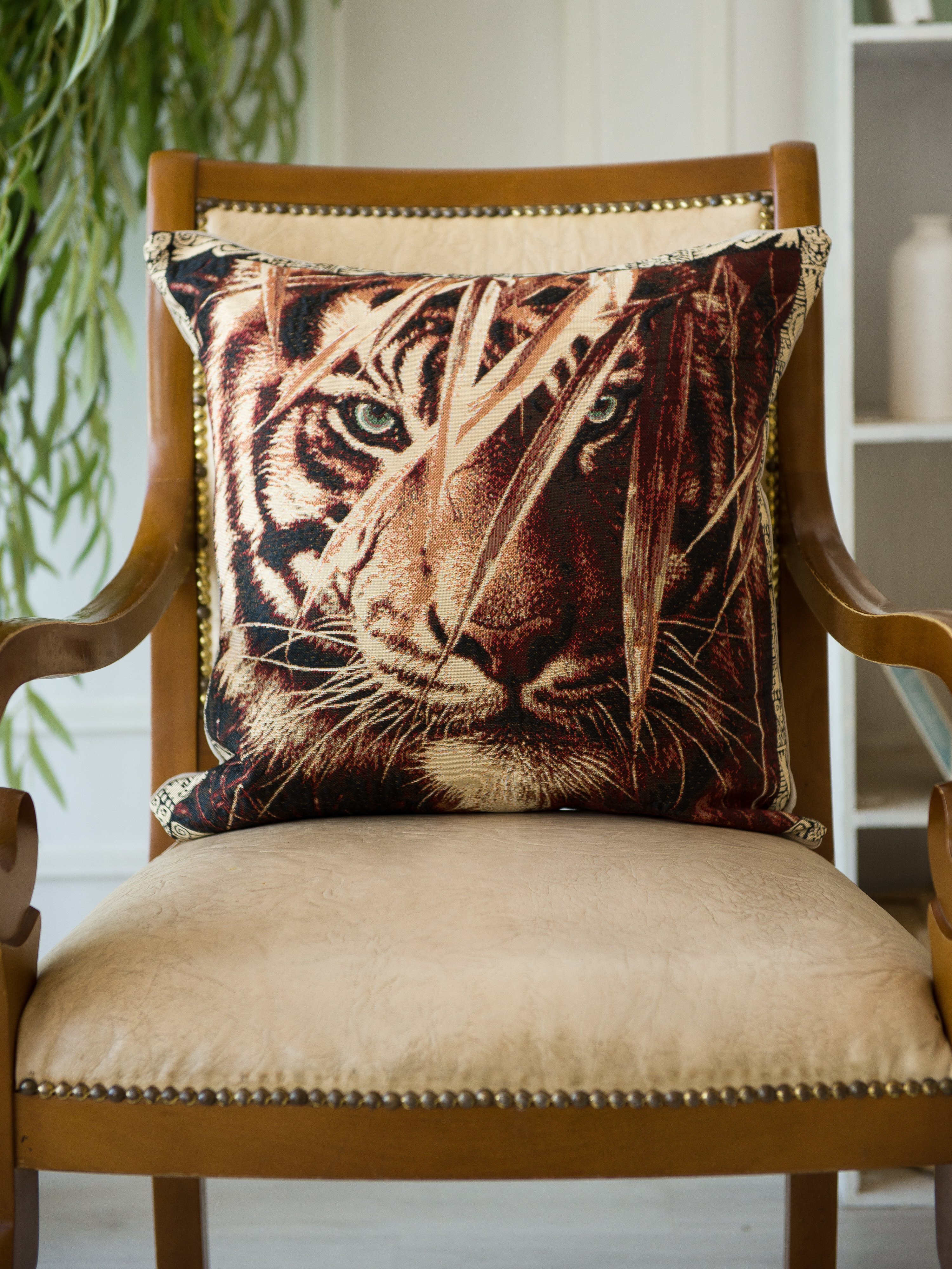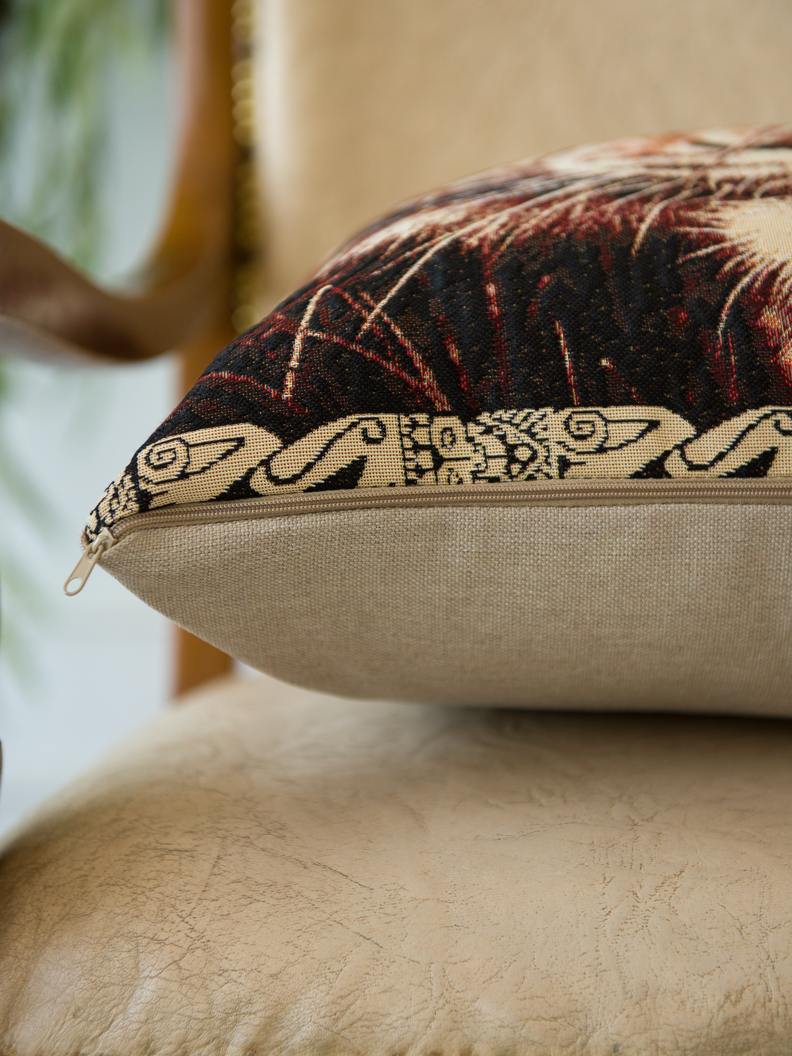 Гобеленовая наволочка для декоративной подушки. Размер наволочки: 47x47см. производство Россия. Изделие собственного производства сшито из отечественной жаккардовой ткани. Задняя часть выполнена из мебельной рогожки так же Российского производства. Все ткани используемые для производства декоративной наволочки производятся с соблюдением ТУ и ГОСТ РФ. Собственное швейное производство позволяет контролировать качество продукции на всех этапах до поступления на склад и предлагать покупателям товары высокого качества по выгодным ценам. Состав ткани 100% полиэстер. Плотность гобелена 380 г/кв.м. Наволочка подходит для подушек размером от 45 до 50 см. Продается без подушки-наполнителя. Подушку-наполнитель так же можно купит у нас. Размер наволочки может отличаться от заявленного +/- 2 см. Допускается деликатная машинная стирка при температуре 30 градусов. Гладить при средней температуре.