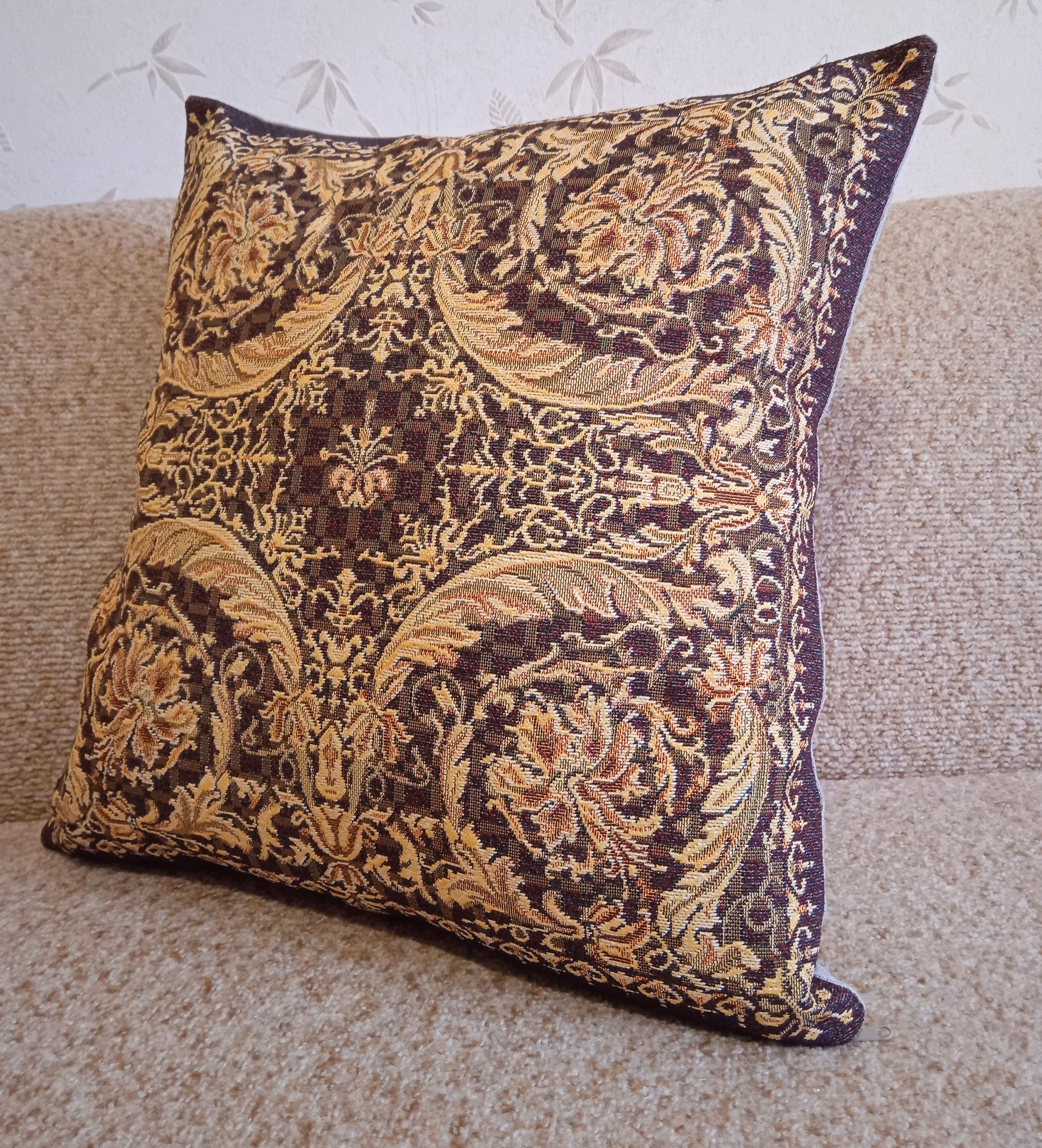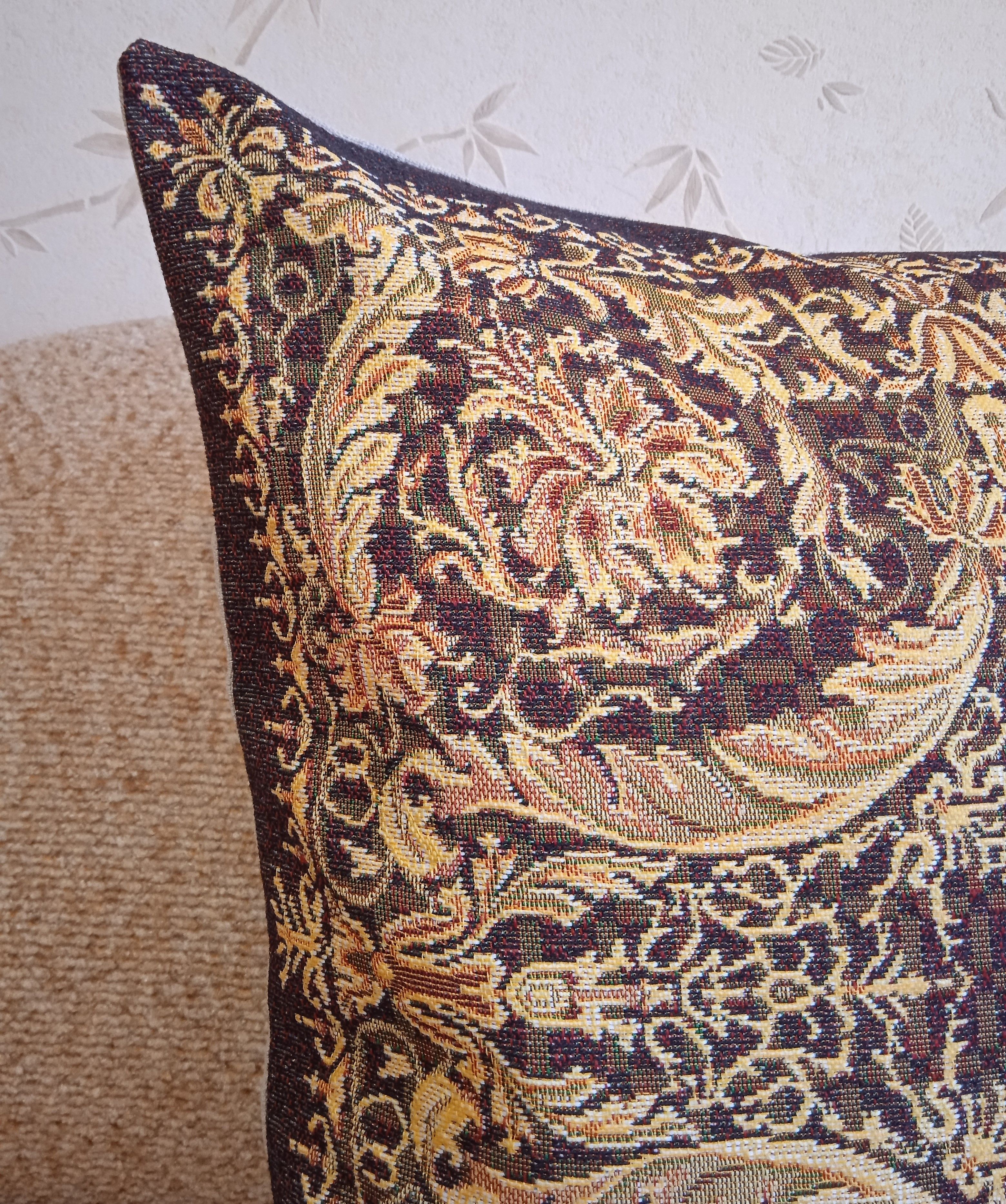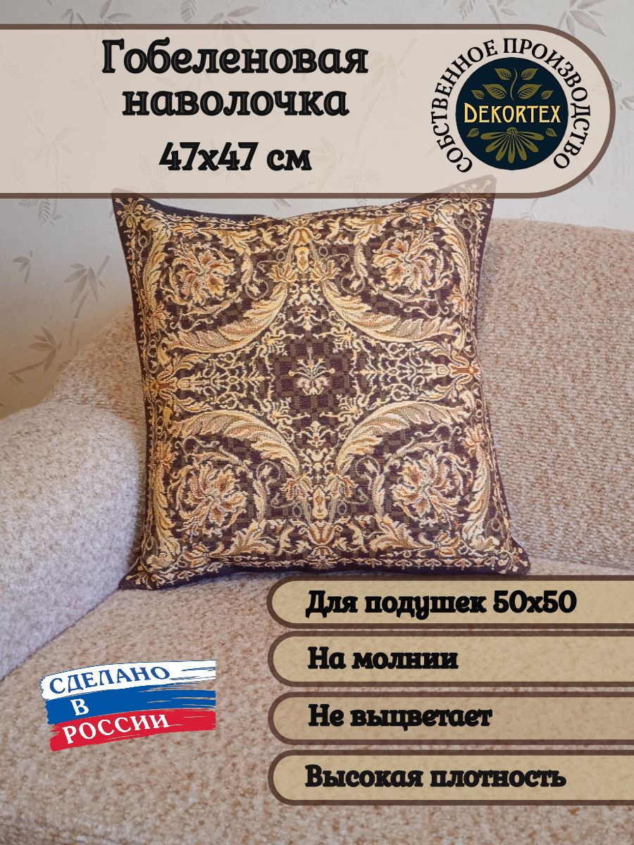 Гобеленовая наволочка для декоративной подушки. Размер наволочки: 47x47см. производство Россия. Изделие собственного производства сшито из отечественной жаккардовой ткани. Задняя часть выполнена из мебельной рогожки так же Российского производства. Все ткани используемые для производства декоративной наволочки производятся с соблюдением ТУ и ГОСТ РФ. Собственное швейное производство позволяет контролировать качество продукции на всех этапах до поступления на склад и предлагать покупателям товары высокого качества по выгодным ценам. Состав ткани 100% полиэстер. Плотность гобелена 380 г/кв.м. Наволочка подходит для подушек размером от 45 до 50 см. Продается без подушки-наполнителя. Подушку-наполнитель так же можно купит у нас. Размер наволочки может отличаться от заявленного +/- 2 см. Допускается деликатная машинная стирка при температуре 30 градусов. Гладить при средней температуре.