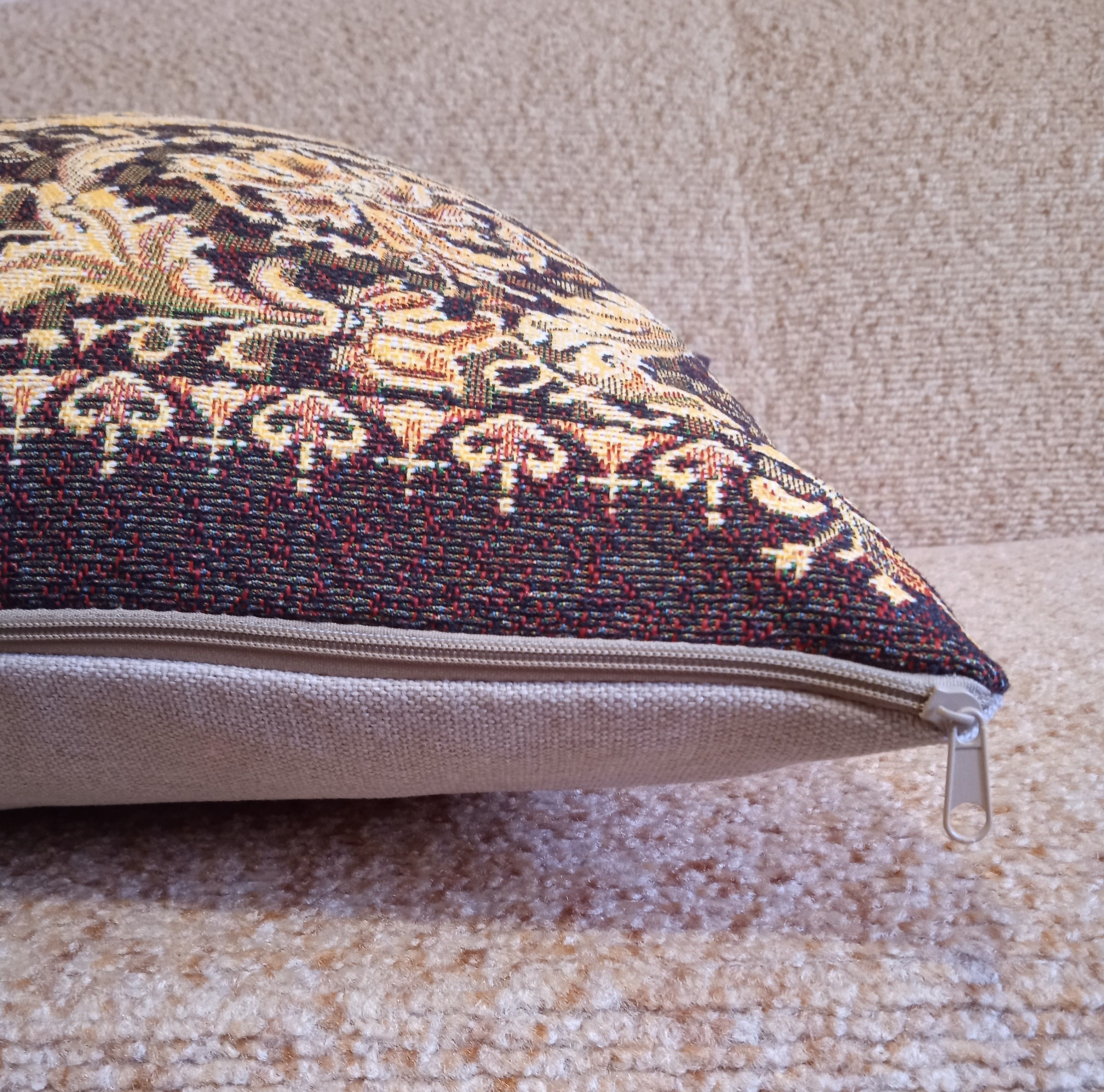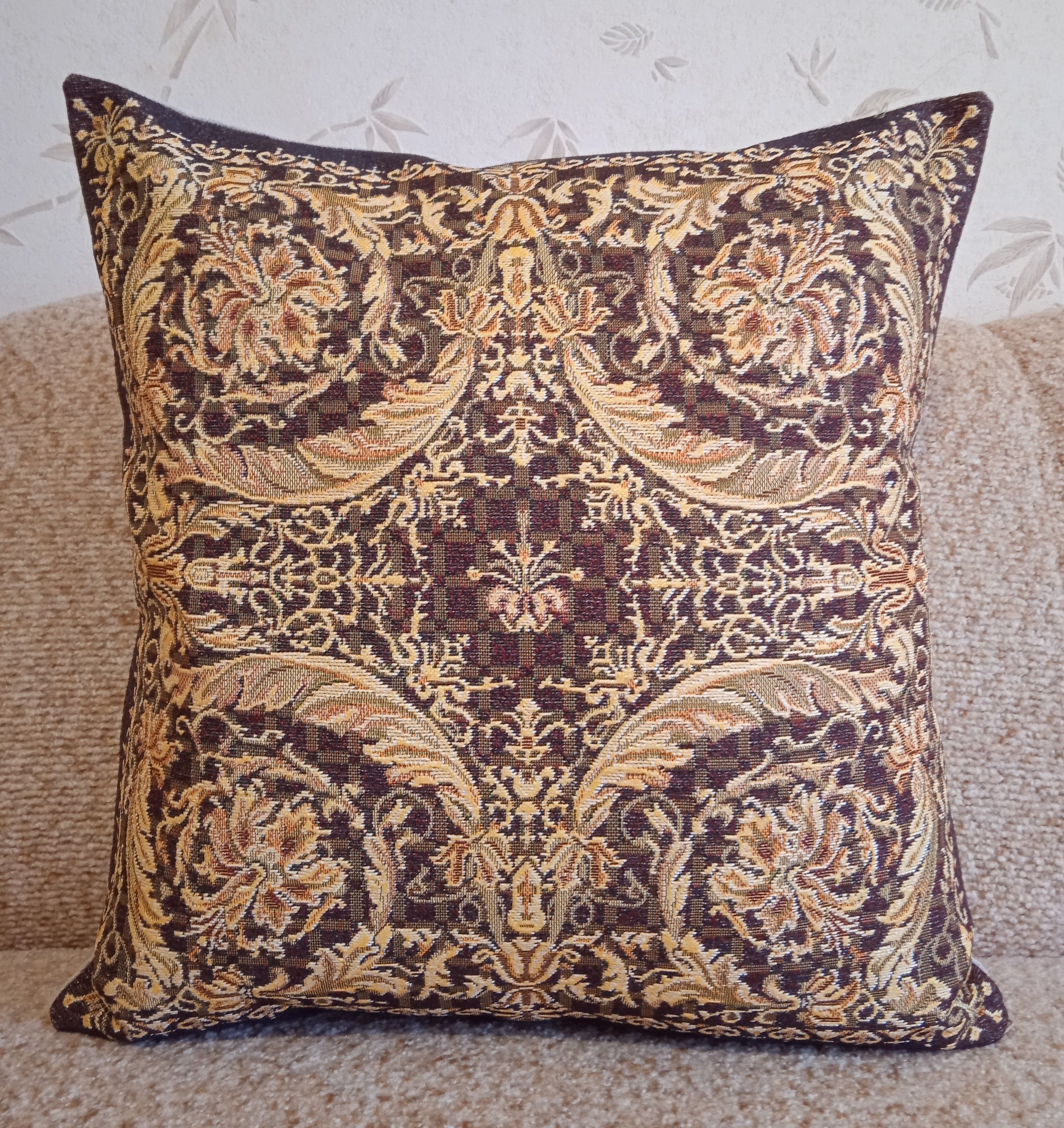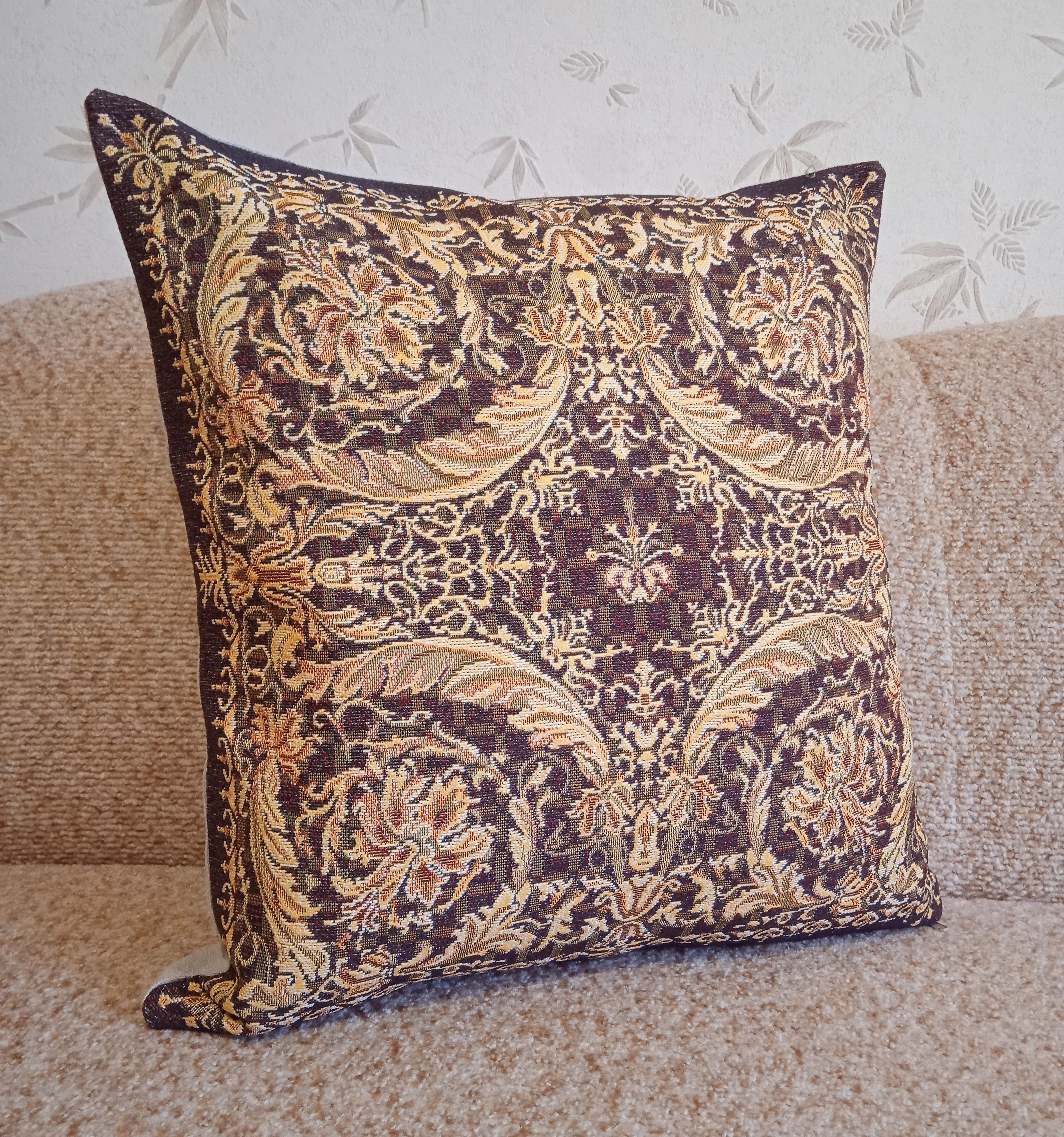 Гобеленовая наволочка для декоративной подушки. Размер наволочки: 47x47см. производство Россия. Изделие собственного производства сшито из отечественной жаккардовой ткани. Задняя часть выполнена из мебельной рогожки так же Российского производства. Все ткани используемые для производства декоративной наволочки производятся с соблюдением ТУ и ГОСТ РФ. Собственное швейное производство позволяет контролировать качество продукции на всех этапах до поступления на склад и предлагать покупателям товары высокого качества по выгодным ценам. Состав ткани 100% полиэстер. Плотность гобелена 380 г/кв.м. Наволочка подходит для подушек размером от 45 до 50 см. Продается без подушки-наполнителя. Подушку-наполнитель так же можно купит у нас. Размер наволочки может отличаться от заявленного +/- 2 см. Допускается деликатная машинная стирка при температуре 30 градусов. Гладить при средней температуре.