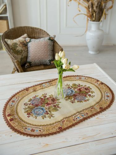 Декоративные гобеленовые дорожки и салфетки - это приятное и полезное украшение для сервировки стола. Размер, цвет и рисунок салфеток можно выбрать по желанию покупателя. Гобеленовые декоративные дорожки не только модный, красивый предмет интерьера но и полезны и практичны в использовании. Они помогут предохранить поверхность мебели от повреждения. Гобеленовые столешницы устойчивы к загрязнению, хорошо стираются при температуре 30 градусов на дают усадки не линяют. Изделия из гобеленовой ткани имеют длительный срок службы и сохраняют первоначальный вид и форму.