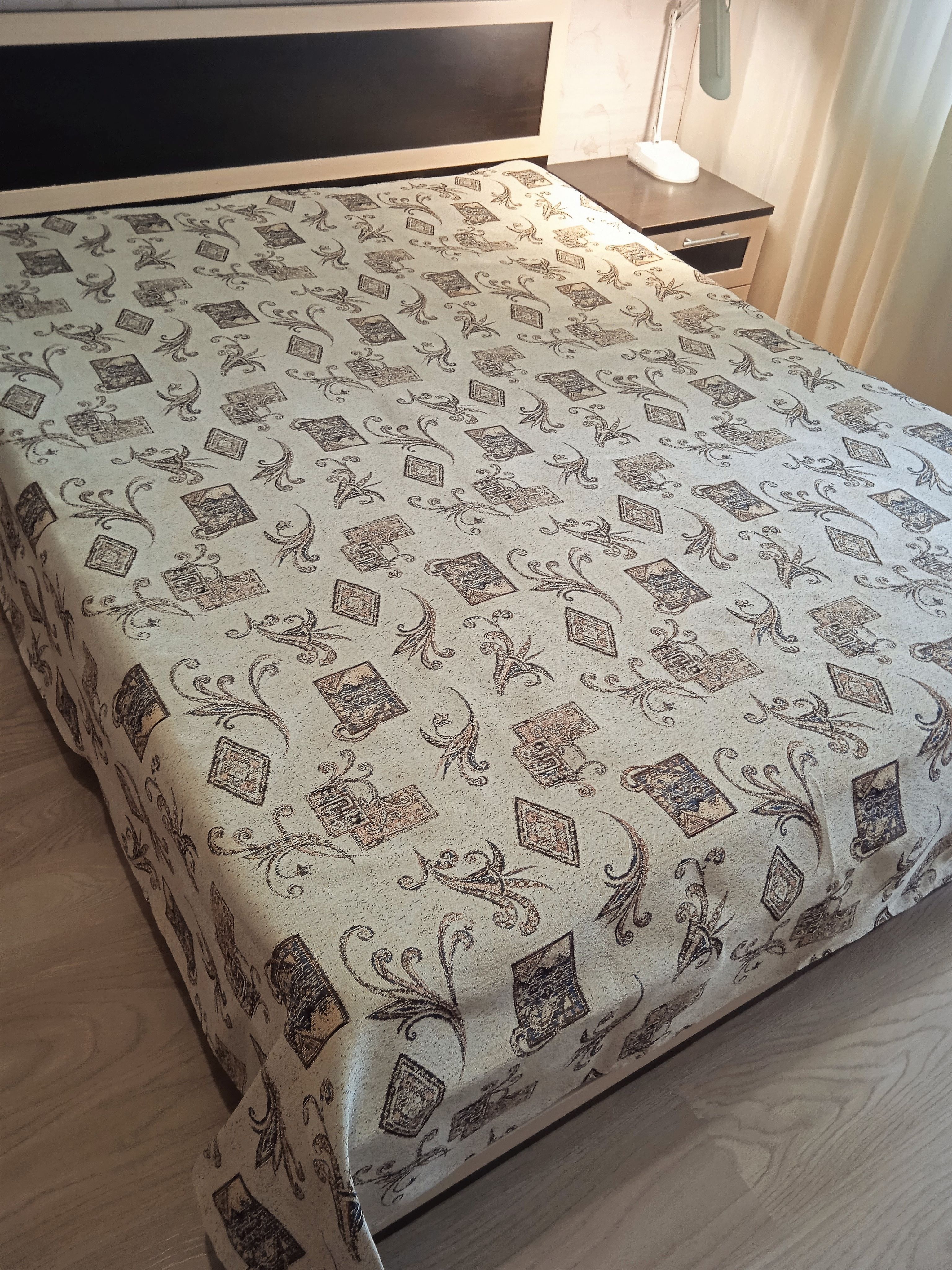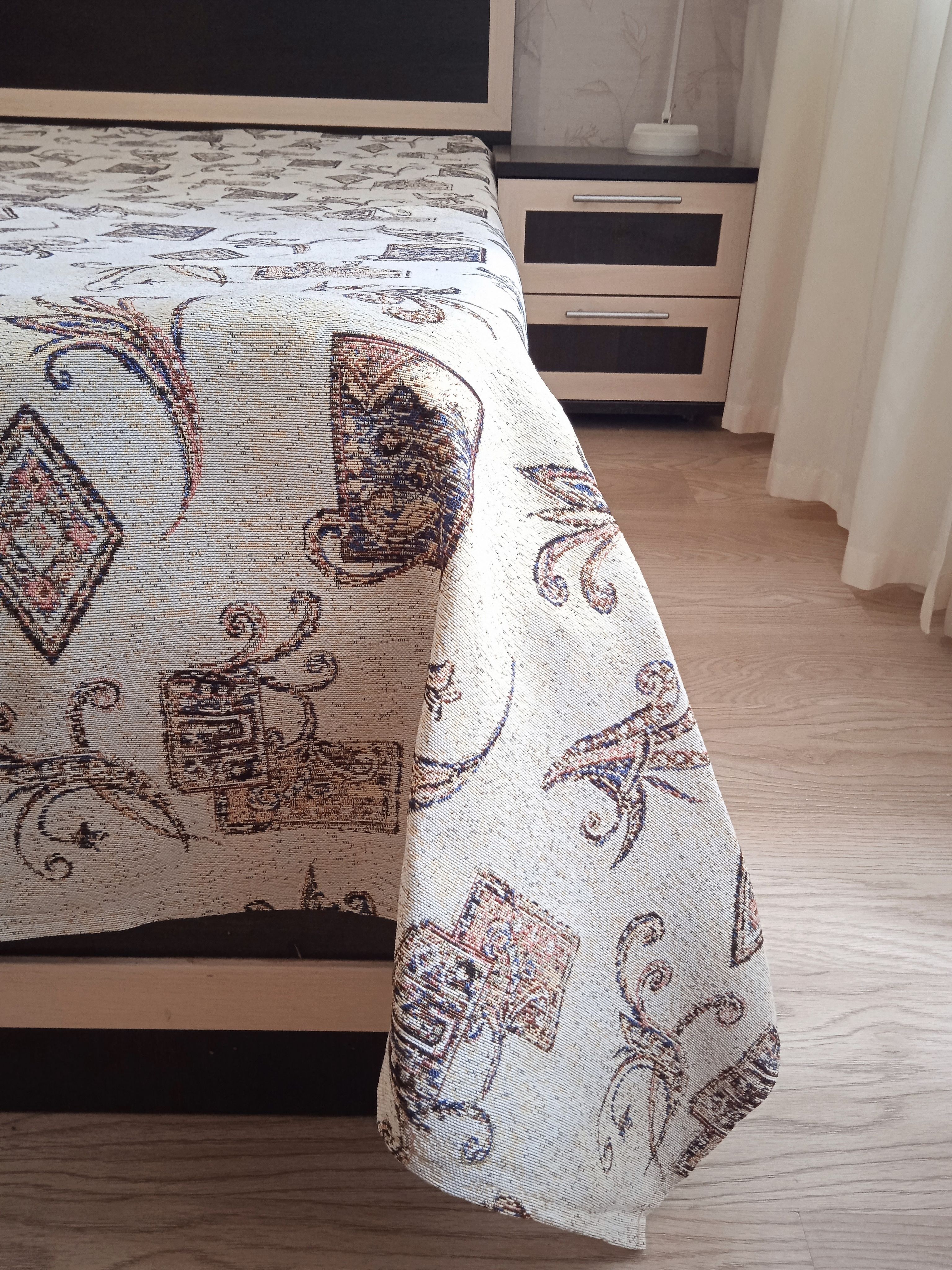 Благодаря высокому качеству гобелена покрывало устойчиво к вытиранию и образованию зацепок, не деформируется и не садится после стирки. Рисунок, отличающийся насыщенностью и стойкостью красок, со временем не потускнеет и будет радовать вас на протяжении долгих лет.