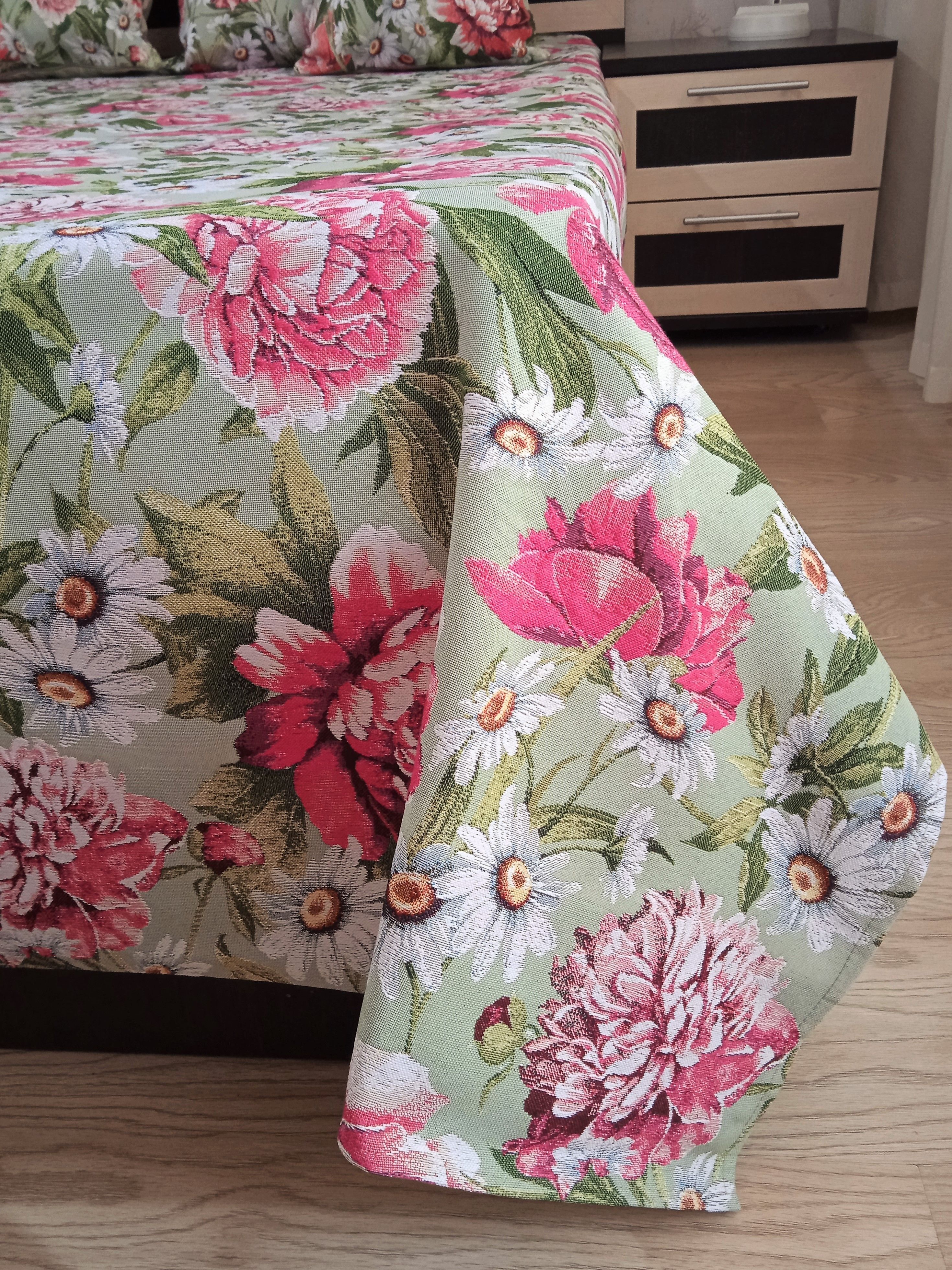 Благодаря высокому качеству гобелена покрывало устойчиво к вытиранию и образованию зацепок, не деформируется и не садится после стирки. Рисунок, отличающийся насыщенностью и стойкостью красок, со временем не потускнеет и будет радовать вас на протяжении долгих лет.