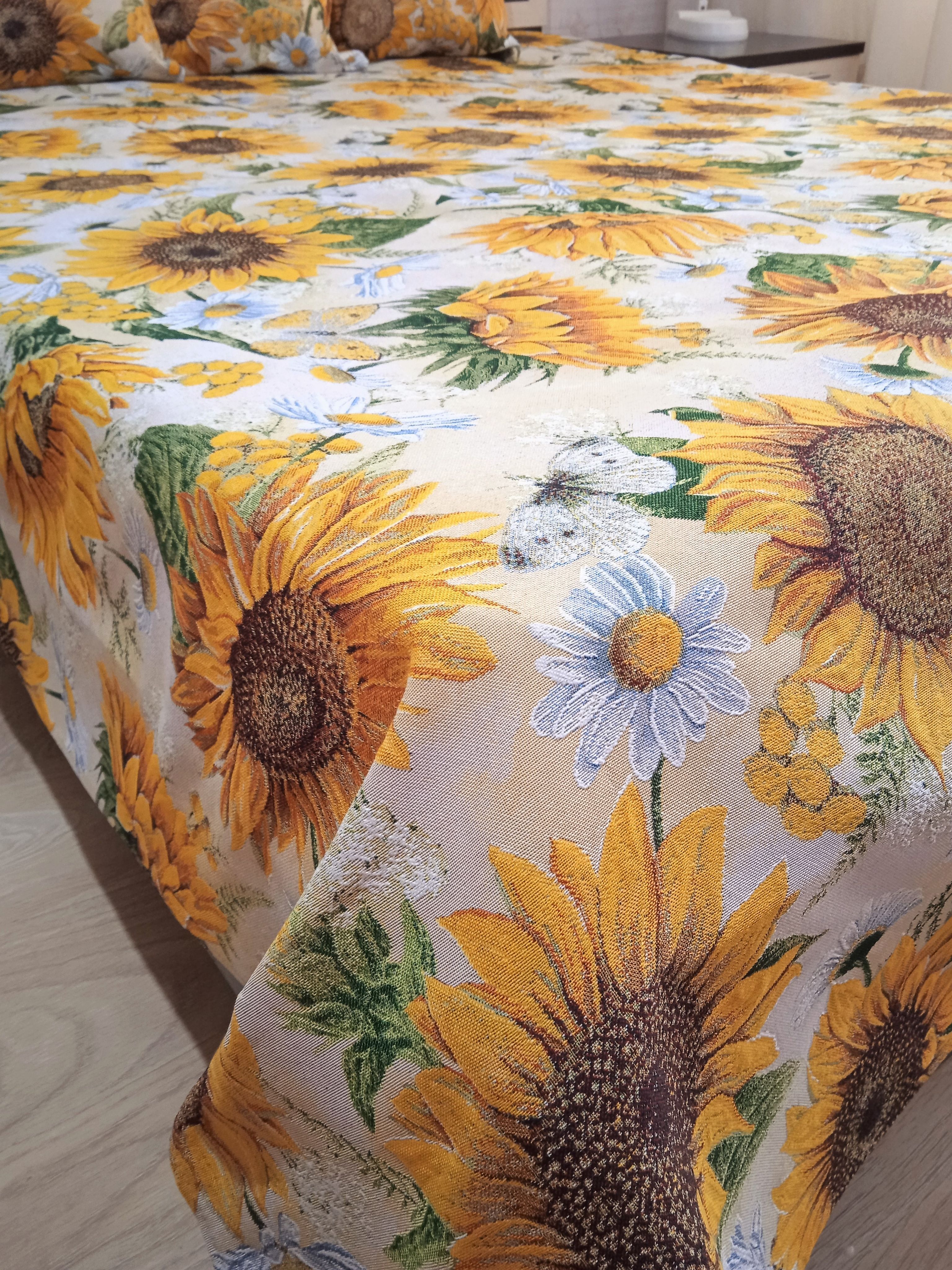 Гобеленовое покрывало «Подсолнухи» защитит мебель от грязи и пыли, добавит красок в интерьер и поможет создать уют в вашем доме или станет прекрасным подарком для ваших друзей и близких.