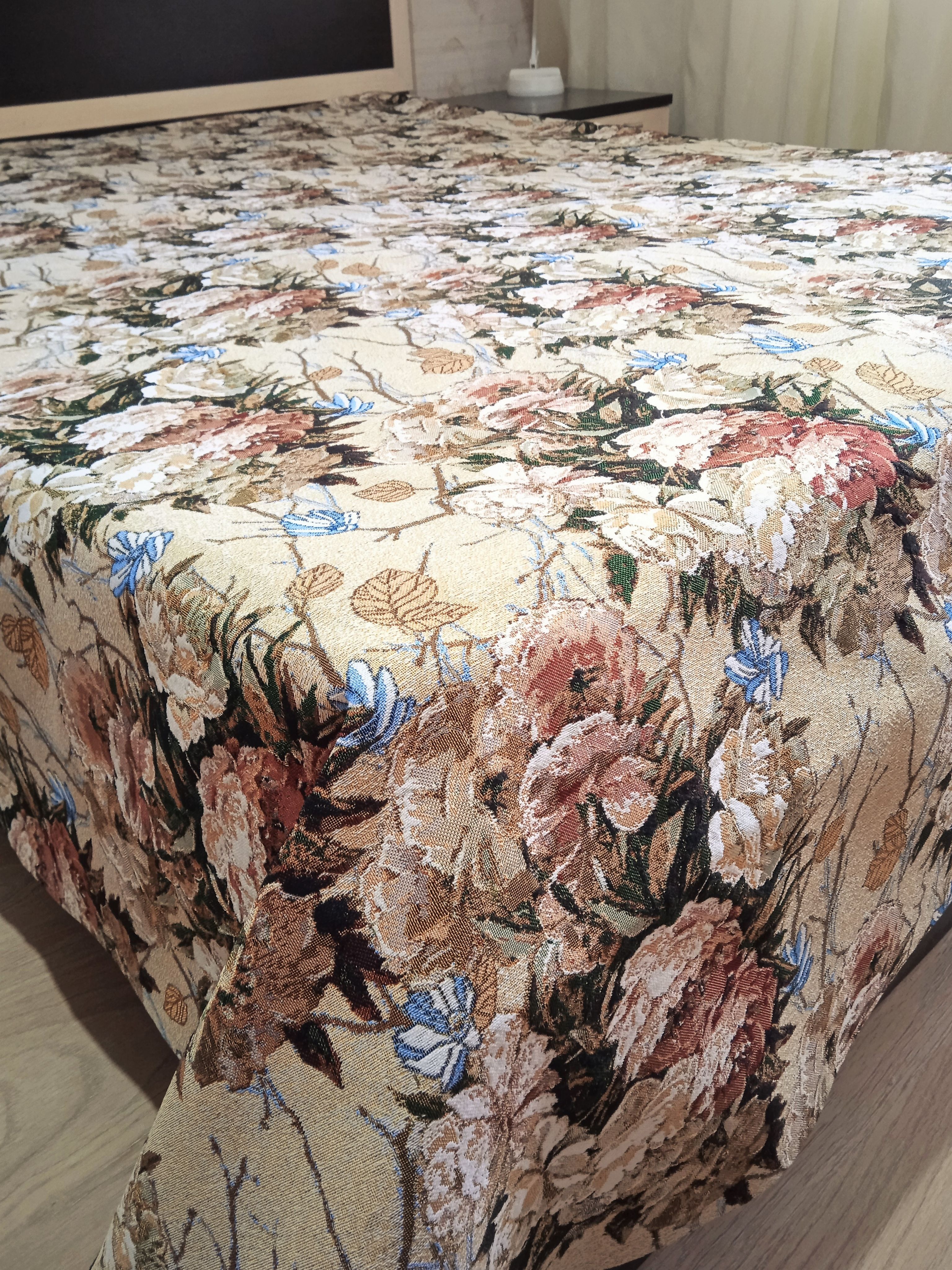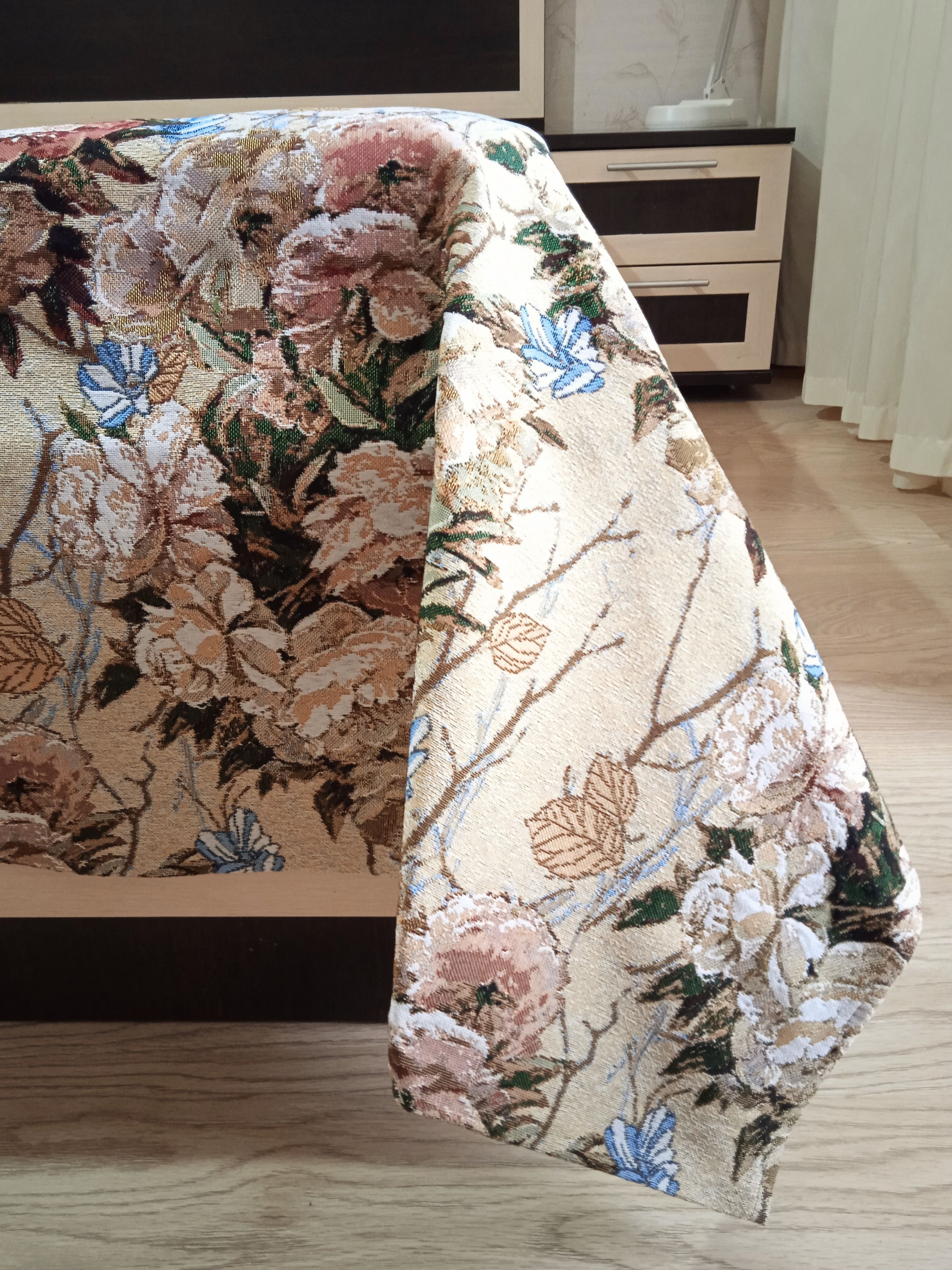 Благодаря высокому качеству гобелена покрывало устойчиво к вытиранию и образованию зацепок, не деформируется и не садится после стирки. Рисунок, отличающийся насыщенностью и стойкостью красок, со временем не потускнеет и будет радовать вас на протяжении долгих лет.