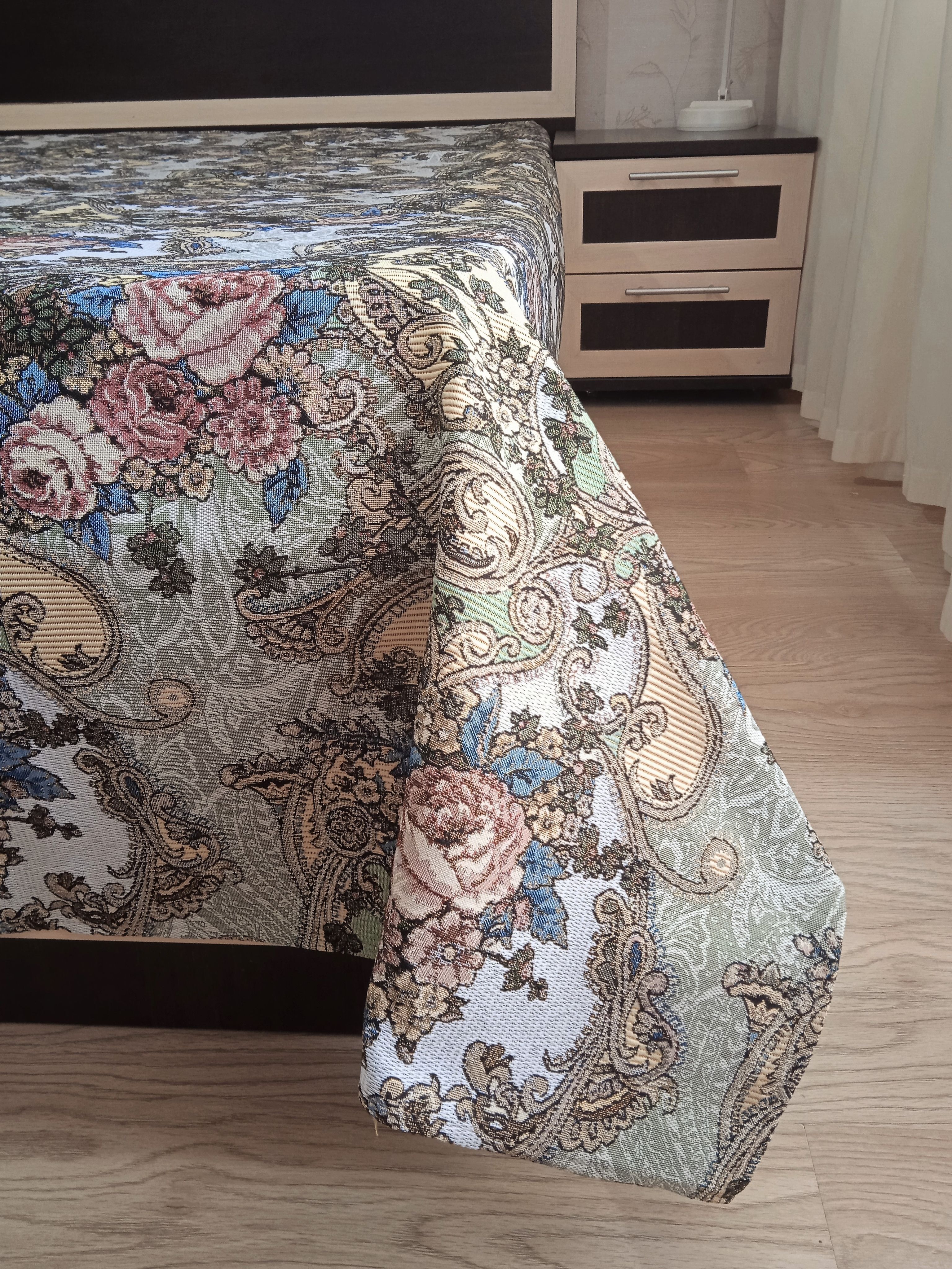 Благодаря высокому качеству гобелена покрывало устойчиво к вытиранию и образованию зацепок, не деформируется и не садится после стирки. Рисунок, отличающийся насыщенностью и стойкостью красок, со временем не потускнеет и будет радовать вас на протяжении долгих лет.