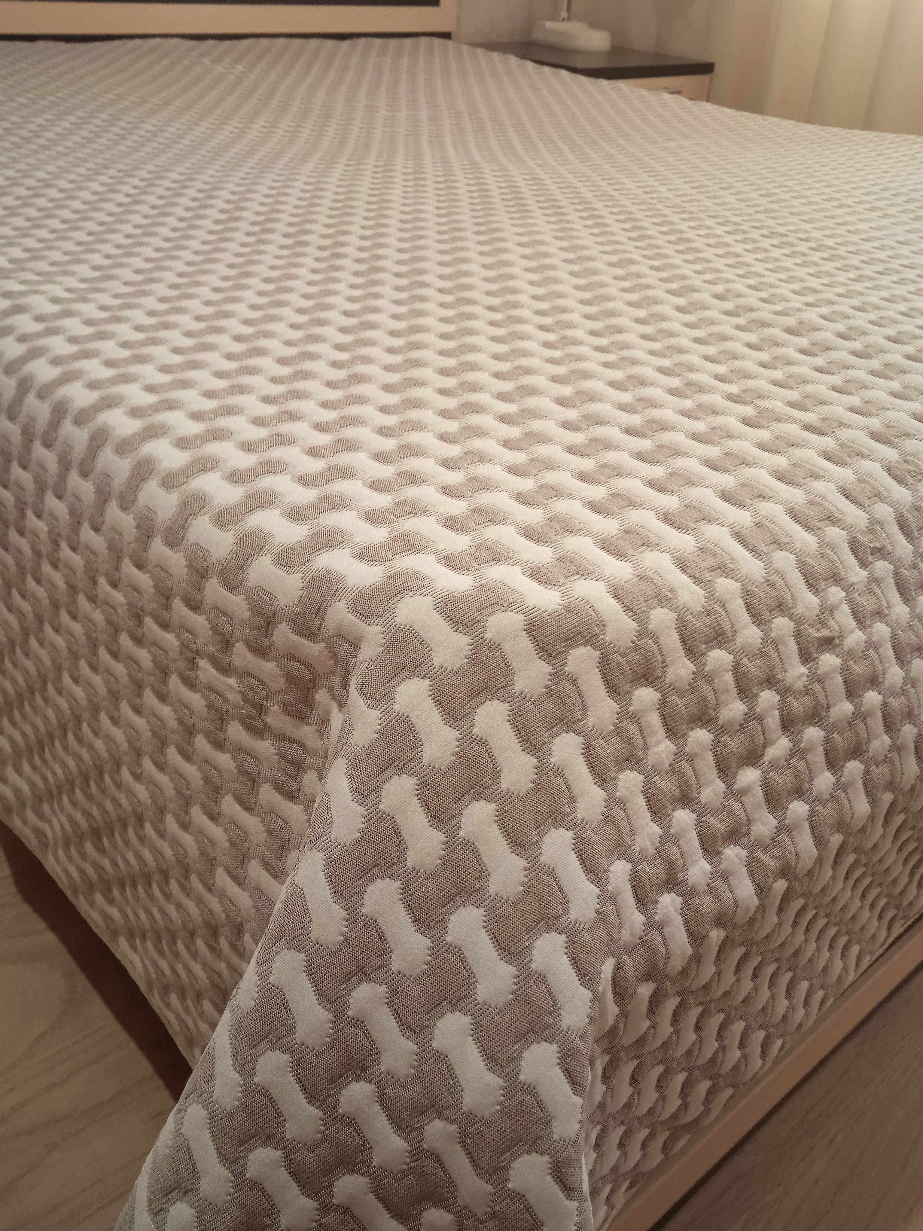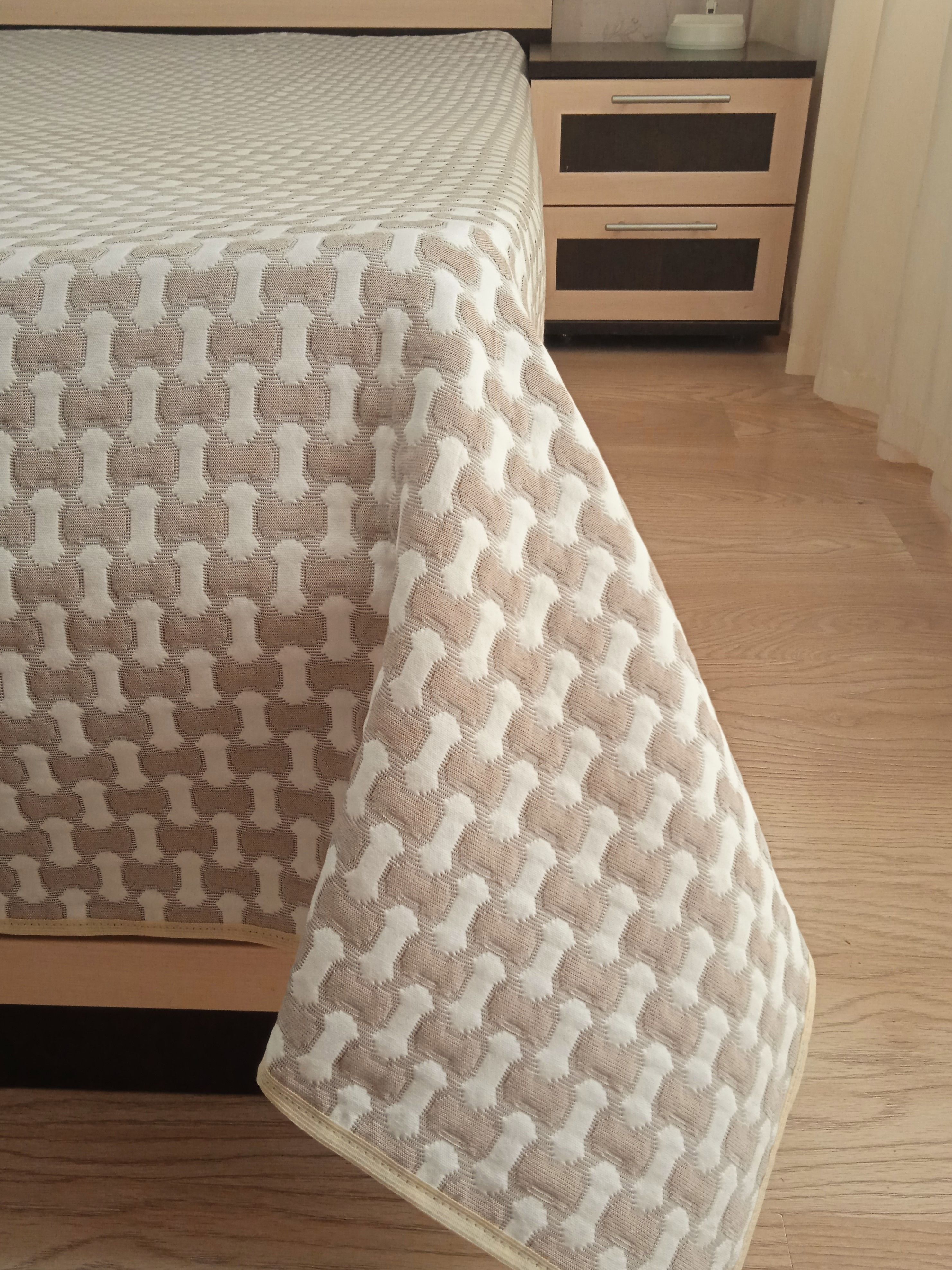 Мягкое, легкое и приятное на ощупь покрывало выпускается в светлых бежевых, коричневых и серых оттенках с неизменно присутствующим белым цветом. Рисунок на сторонах одинаковый но отличается по плотности окраса поверхности. Перевернув покрывало на другую сторону вы увидите тот же рисунок с большей или меньшей насыщенностью цвета.