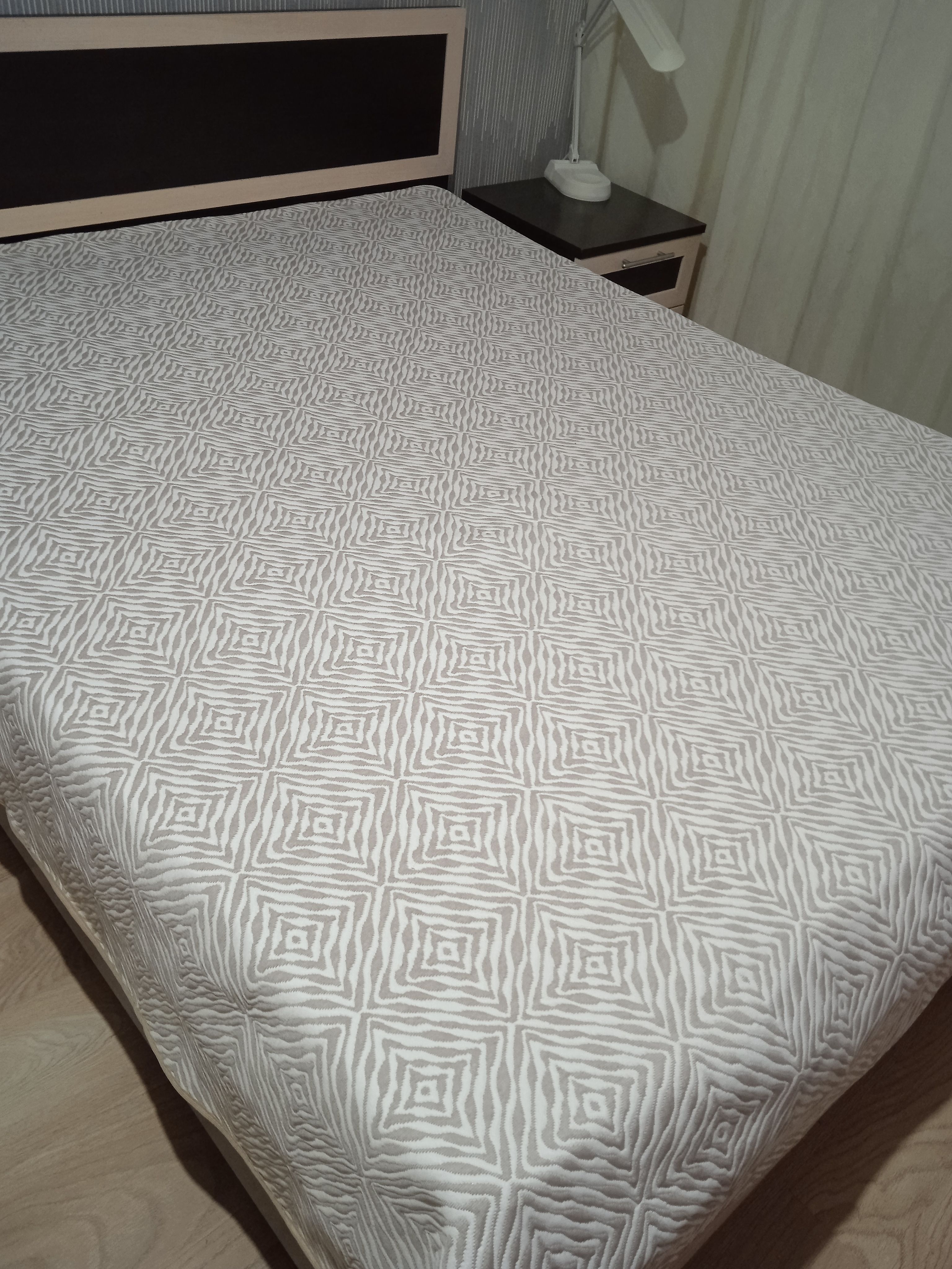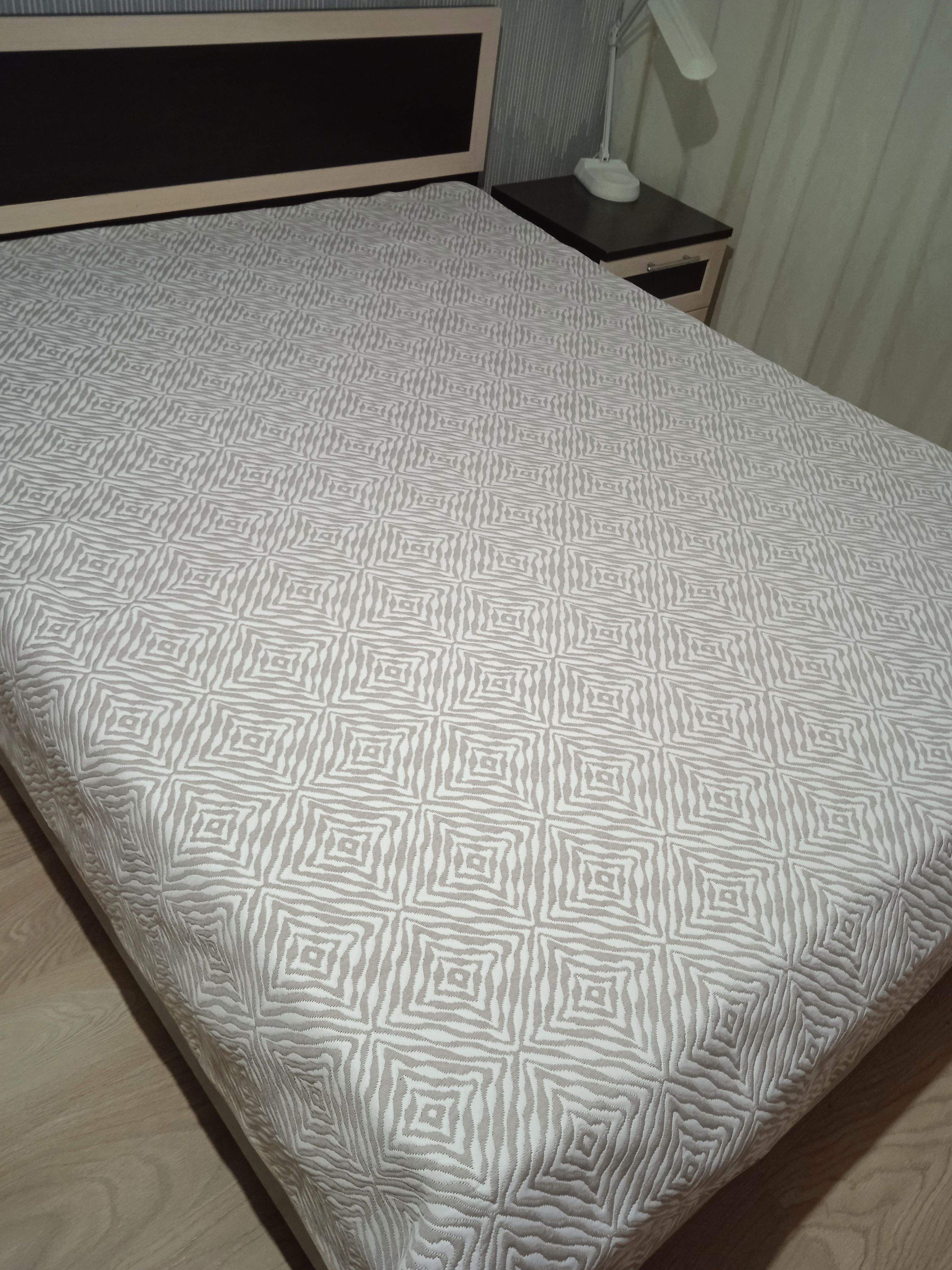 Мягкое, легкое и приятное на ощупь покрывало выпускается в светлых бежевых, коричневых и серых оттенках с неизменно присутствующим белым цветом. Рисунок на сторонах одинаковый но отличается по плотности окраса поверхности. Перевернув покрывало на другую сторону вы увидите тот же рисунок с большей или меньшей насыщенностью цвета.