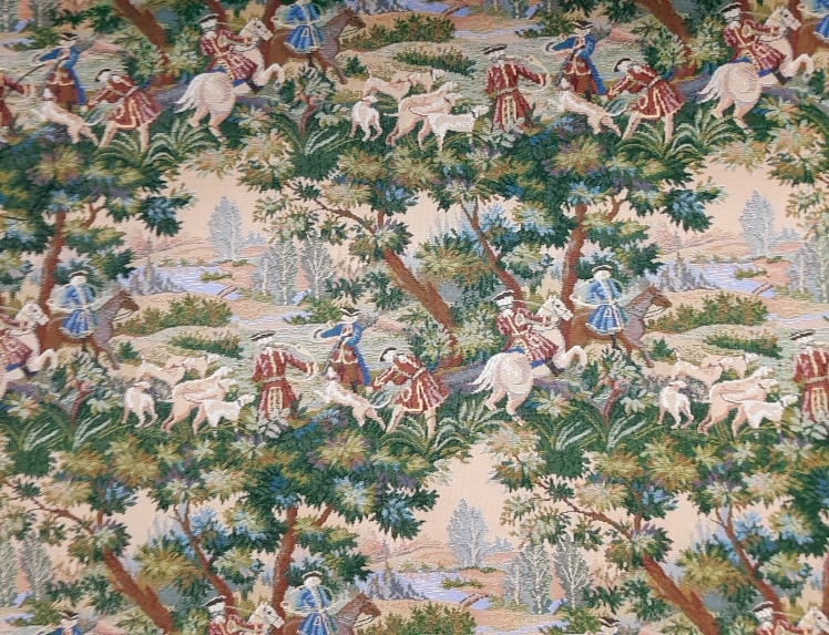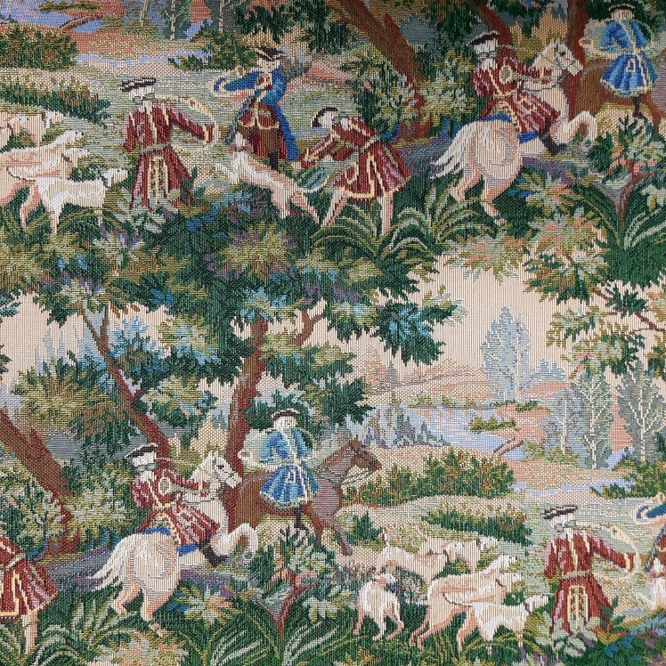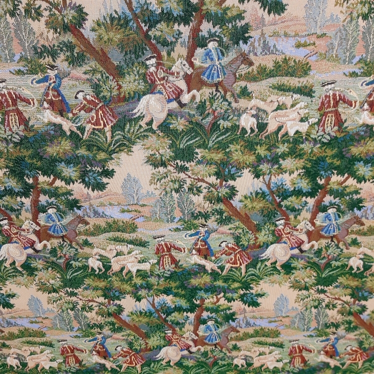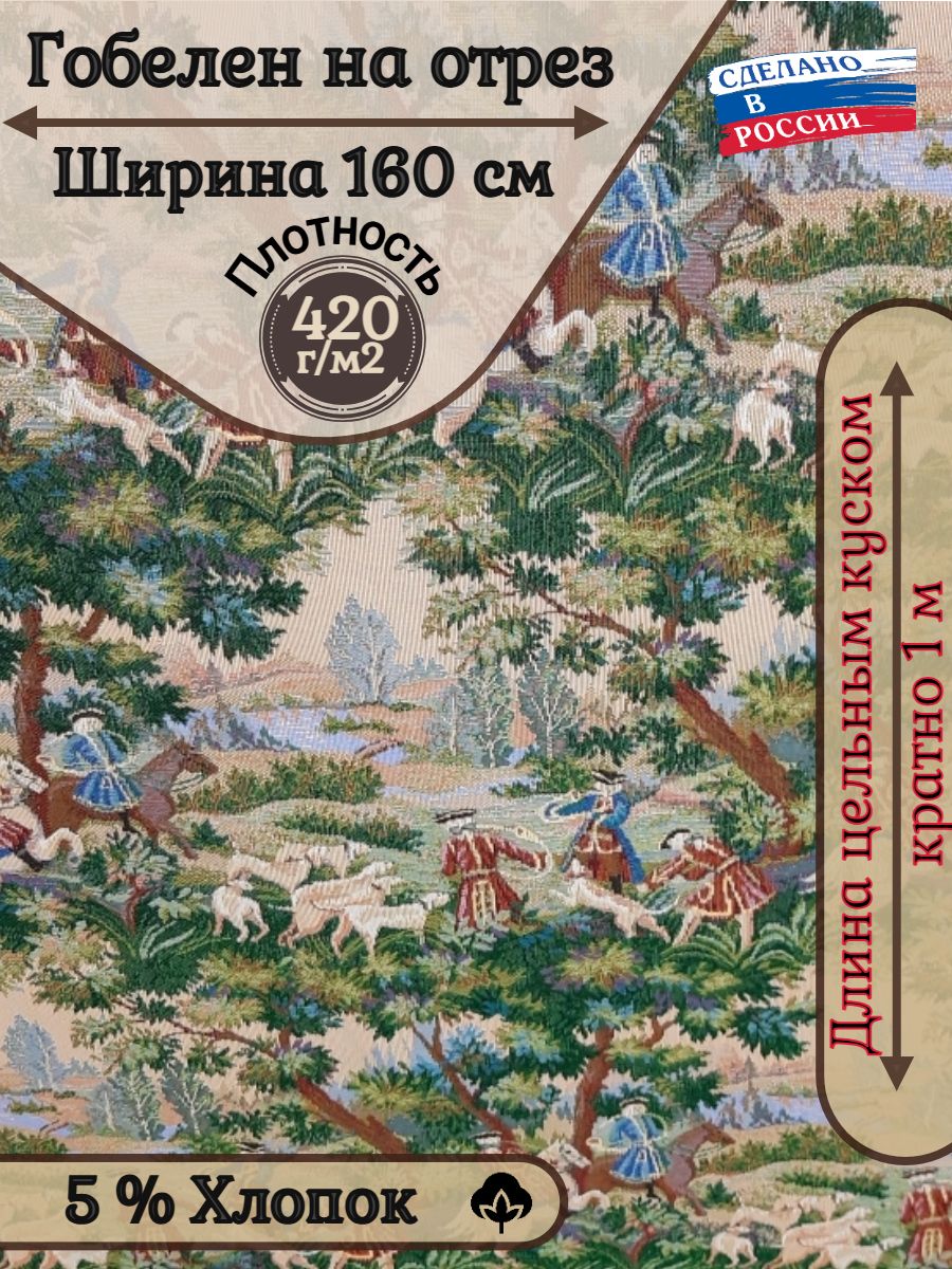 Ткань гобеленовая для обивки и перетяжки мебели "Королевская охота" Российского производства, повышенной плотности, с высоким содержанием хлопка. Ширина 160 см. ; Плотность 420 г/кв.м.. ; Состав 5% Хлопок, 95% п/э. Гобеленовые ткани отлично подходят для обивки мягкой мебели, стульев, используются для пошива покрывал, скатертей драпировки стен, интерьерных подушек и других предметов домашнего текстиля. Плотные и прочные гобеленовые ткани отличаются высокой износостойкостью и длительным сроком службы, хорошо стираются при температуре 30 градусов, практически не дают усадку и не линяют. Гобелены Российского производства продаются по цене гораздо ниже аналогичных импортных тканей, что делает покупку более выгодной и экономит ваши деньги.