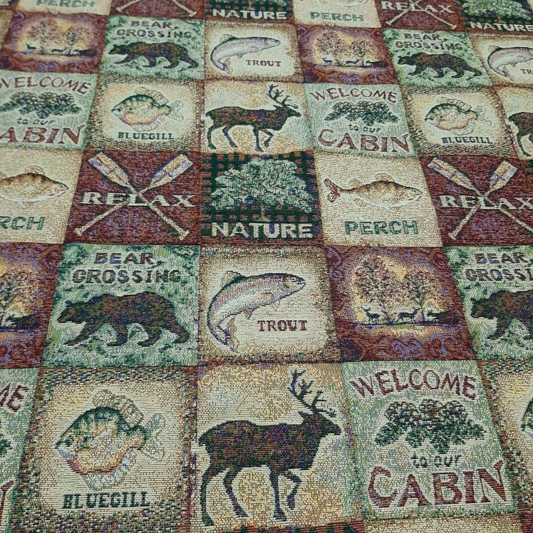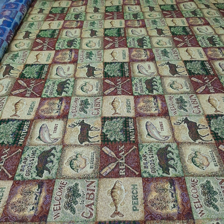 Ткань гобеленовая для обивки и перетяжки мебели "Шале охота" Российского производства, повышенной плотности, с высоким содержанием хлопка. Ширина 160 см. ; Плотность 380 см. ; Состав 45% хлопок. 55% п/э. Гобеленовые ткани отлично подходят для обивки мягкой мебели, стульев, используются для пошива покрывал, скатертей драпировки стен, интерьерных подушек и других предметов домашнего текстиля. Плотные и прочные гобеленовые ткани отличаются высокой износостойкостью и длительным сроком службы, хорошо стираются при температуре 30 градусов, практически не дают усадку и не линяют. Гобелены Российского производства продаются по цене гораздо ниже аналогичных импортных тканей, что делает покупку более выгодной и экономит ваши деньги.
